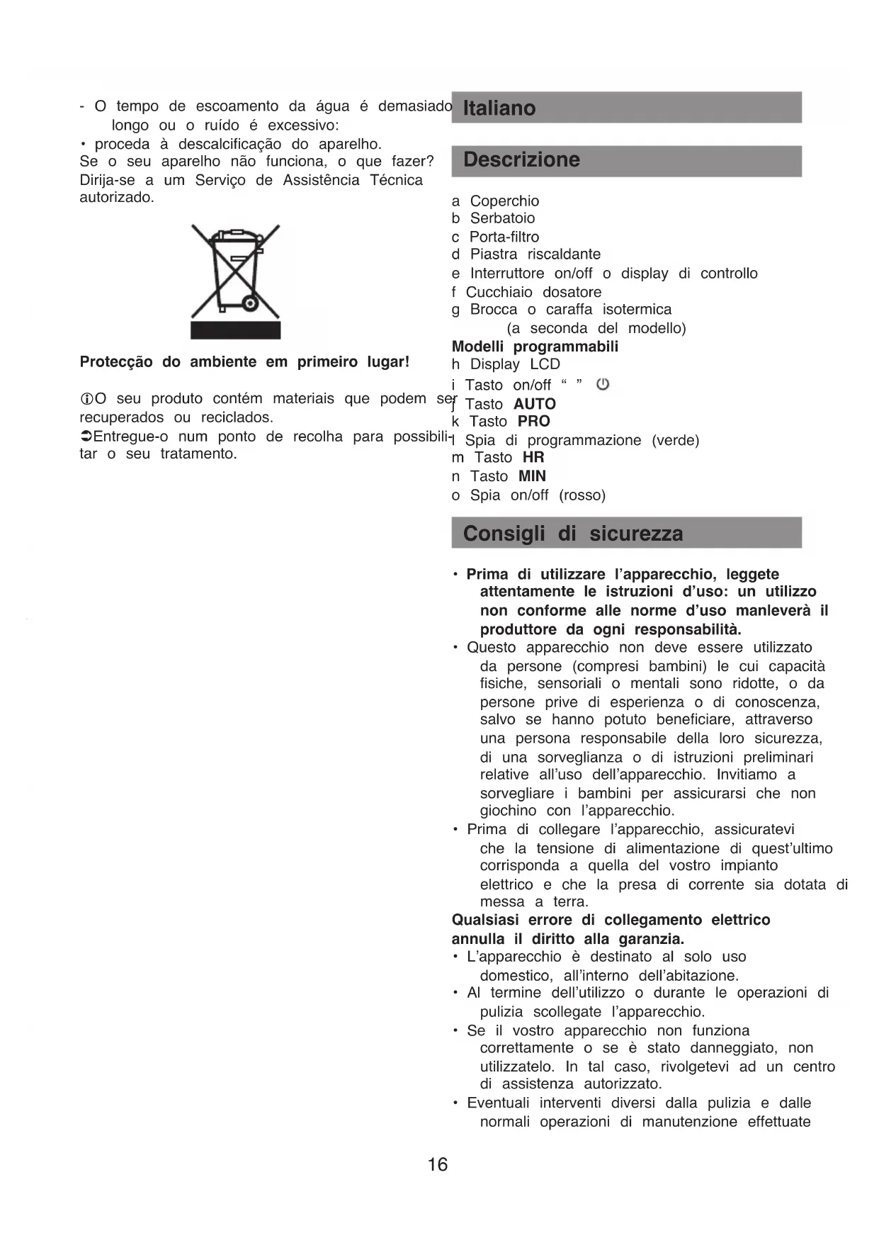 - Chiudete sempre il coperchio (a) quando la caffettiera è in funzione.