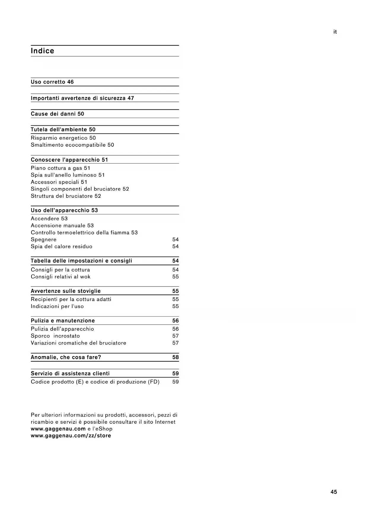 Indice Istruzioni per l’uso Uso corretto 46 Importanti avvertenze di sicurezza 47 Cause dei danni 50 Tutela dell'ambiente 50 Risparmio energetico 50 Smaltimento ecocompatibile 50 Conoscere l'apparecchio 51 Piano cottura a gas 51 Spia sull'anello luminoso 51 Accessori speciali 51 Singoli componenti del bruciatore 52 Struttura del bruciatore 52 Uso dell’apparecchio 53 Accendere 53 Accensione manuale 53 Controllo termoelettrico della fiamma 53 Spegnere 54 Spia del calore residuo 54 Tabella delle impostazioni e consigli 54 Consigli per la cottura 54 Consigli relativi al wok 55 Avvertenze sulle stoviglie 55 Recipienti per la cottura adatti 55 Indicazioni per l'uso 55 Pulizia e manutenzione 56 Pulizia dell’apparecchio 56 Sporco incrostato 57 Variazioni cromatiche del bruciatore 57 Anomalie, che cosa fare? 58 Servizio di assistenza clienti 59 Codice prodotto (E) e codice di produzione (FD) 59 Per ulteriori informazioni su prodotti, accessori, pezzi di ricambio e servizi è possibile consultare il sito Internet www.gaggenau.com e l'eShop www.gaggenau.com/zz/store46 it Uso corretto m Uso corretto Uso corretto Leggere attentamente le presenti istruzioni per l'uso. Solo così è possibile utilizzare l'apparecchio in modo sicuro e corretto. Custodire con la massima cura le presenti istruzioni per l'uso e il montaggio in caso di un utilizzo futuro o cessione a terzi. Questo apparecchio è concepito esclusivamente per l'incasso. Osservare le speciali istruzioni di montaggio. Questo apparecchio deve essere installato secondo le istruzioni per il montaggio fornite. Controllare l'apparecchio dopo averlo disimballato. Qualora si fossero verificati danni da trasporto, non collegare l'apparecchio. L'allacciamento dell'apparecchio può essere effettuato solo da un tecnico autorizzato. In caso di danni causati da un allacciamento non corretto, decade il diritto di garanzia. Per la conversione a un altro tipo di gas rivolgersi al servizio di assistenza clienti. Questo apparecchio è pensato esclusivamente per l'utilizzo in abitazioni private e in ambito domestico. Utilizzare l'apparecchio solo per cucinare e preparare bevande e non per generare calore. Prestare attenzione all'apparecchio durante il suo funzionamento. Usare l'apparecchio solo al chiuso. Questo apparecchio non deve essere installato su barche o veicoli. Questo apparecchio è progettato solo per l'utilizzo fino ad un'altezza di massimo 4000 metri sul livello del mare. Questo apparecchio non è da utilizzare con un timer esterno o un telecomando separato. Non utilizzare alcuna copertura del piano cottura. Potrebbe causare incidenti, dovuti ad es. al surriscaldamento, alla formazione di fiamme o agli schizzi di materiale. Utilizzare soltanto le protezioni o le griglie di protezione per i bambini approvate da noi. Le protezioni o le griglie di protezione per i bambini non idonee possono provocare incidenti. Questo apparecchio può essere utilizzato da bambini di età pari o superiore a 8 anni e da persone con ridotte facoltà fisiche, sensoriali o mentali nonché da persone prive di sufficiente esperienza o conoscenza dello stesso se sorvegliate da una persona responsabile della loro sicurezza o se istruite in merito all'utilizzo sicuro dell'apparecchio e consapevoli degli eventuali rischi derivanti da un utilizzo improprio. I bambini non devono utilizzare l'apparecchio come un giocattolo. I bambini non devono né pulire né utilizzare l'apparecchio da soli a meno che non abbiano un'età superiore agli 15 anni e che siano assistiti da parte di un adulto. Tenere lontano dall'apparecchio e dal cavo di alimentazione i bambini di età inferiore agli 8 anni. Chiudere la valvola di sicurezza della linea di alimentazione quando l'apparecchio non è in funzione per molto tempo.47 Importanti avvertenze di sicurezza