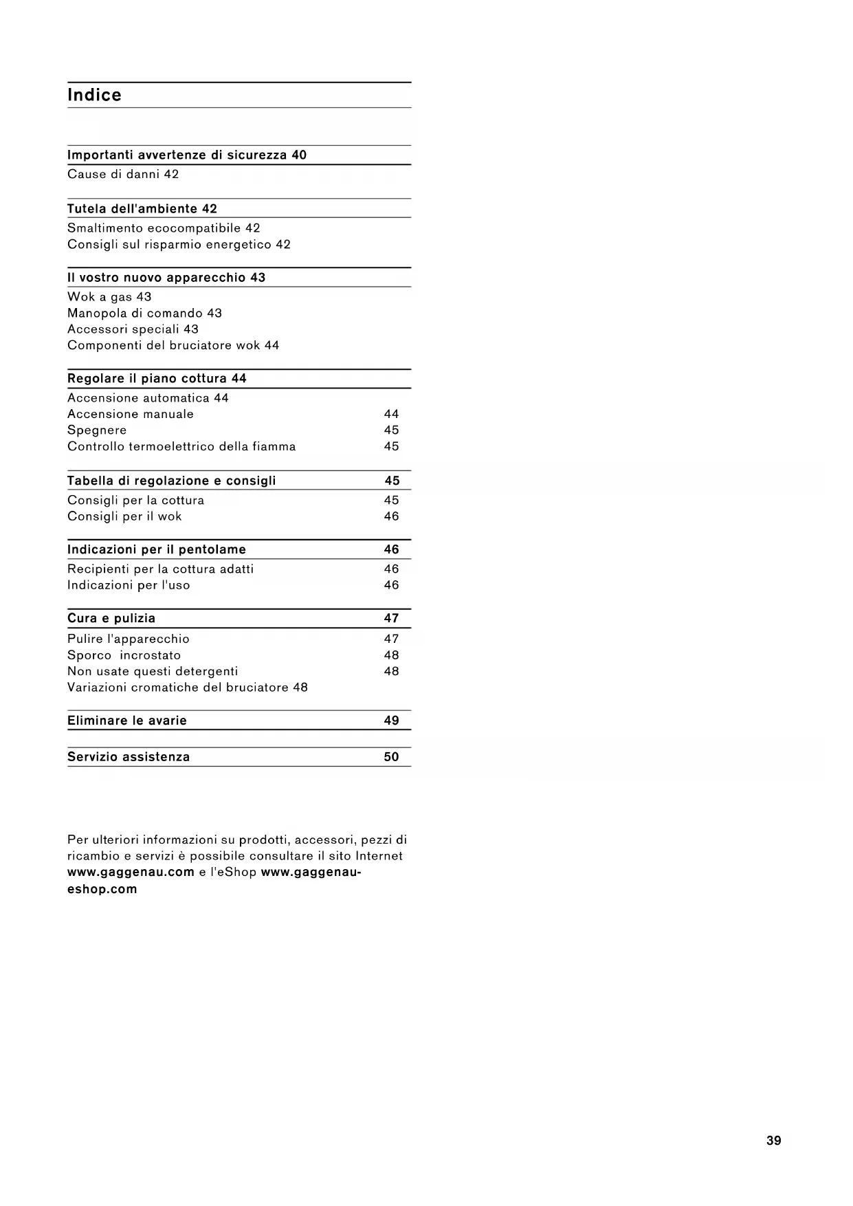 B 070 222 148 FR 01 40 10 42 12 CH 0848 840 04039 Indice Istruzioni per l’uso Importanti avvertenze di sicurezza 40 Cause di danni 42 Tutela dell'ambiente 42 Smaltimento ecocompatibile 42 Consigli sul risparmio energetico 42 Il vostro nuovo apparecchio 43 Wok a gas 43 Manopola di comando 43 Accessori speciali 43 Componenti del bruciatore wok 44 Regolare il piano cottura 44 Accensione automatica 44 Accensione manuale 44 Spegnere 45 Controllo termoelettrico della fiamma 45 Tabella di regolazione e consigli 45 Consigli per la cottura 45 Consigli per il wok 46 Indicazioni per il pentolame 46 Recipienti per la cottura adatti 46 Indicazioni per l'uso 46 Cura e pulizia 47 Pulire l'apparecchio 47 Sporco incrostato 48 Non usate questi detergenti 48 Variazioni cromatiche del bruciatore 48 Eliminare le avarie 49 Servizio assistenza 50 : Per ulteriori informazioni su prodotti, accessori, pezzi di ricambio e servizi è possibile consultare il sito Internet www.gaggenau.com e l'eShop www.gaggenau- eshop.com40 m Importanti avvertenze di sicurezza Leggere attentamente le presenti istruzioni per l'uso. Solo così è possibile utilizzare l'apparecchio in modo sicuro e corretto. Custodire con la massima cura le presenti istruzioni per l'uso e il montaggio in caso di un utilizzo futuro o cessione a terzi. Questo apparecchio deve essere installato secondo le istruzioni per il montaggio fornite. Controllare l'apparecchio dopo averlo disimballato. Qualora si fossero verificati danni da trasporto, non collegare l'apparecchio. L'allacciamento dell'apparecchio può essere effettuato solo da un tecnico autorizzato. In caso di danni causati da un allacciamento non corretto, decade il diritto di garanzia. Per la conversione a un altro tipo di gas rivolgersi al servizio di assistenza clienti. Questo apparecchio è pensato esclusivamente per l'utilizzo in abitazioni private e in ambito domestico. Utilizzare l'apparecchio solo per cucinare e preparare bevande e non per generare calore. Prestare attenzione all'apparecchio durante il suo funzionamento. Usare l'apparecchio solo al chiuso. Questo apparecchio è progettato solo per l'utilizzo fino ad un'altezza di massimo 2000 metri sul livello del mare. Questo apparecchio non è da utilizzare con un timer esterno o un telecomando separato. Non utilizzare dispositivi di protezione o griglie di protezione per bambini non adatti. Potrebbero causare incidenti. Questo apparecchio può essere utilizzato da bambini di età pari o superiore a 8 anni e da persone con ridotte facoltà fisiche, sensoriali o mentali nonché da persone prive di sufficiente esperienza o conoscenza dello stesso se sorvegliate da una persona responsabile della loro sicurezza o se istruite in merito all'utilizzo sicuro dell'apparecchio e consapevoli degli eventuali rischi derivanti da un utilizzo improprio. I bambini non devono utilizzare l'apparecchio come un giocattolo. I bambini non devono né pulire né utilizzare l'apparecchio da soli a meno che non abbiano un'età superiore agli 8 anni e che siano assistiti da parte di un adulto. Tenere lontano dall'apparecchio e dal cavo di alimentazione i bambini di età inferiore agli 8 anni. CHE COSA FARE SE SI SENTE ODORE DI GAS! Il gas che fuoriesce può causare un'esplosione. Se si notano odore di gas oppure anomalie nell'installazione a gas: ▯ Chiudere immediatamente l'alimentazione del gas o la valvola della bombola del gas. ▯ Spegnere immediatamente fuochi accesi o sigarette. ▯ Non azionare l'interruttore della luce né quello dell'apparecchio, non estrarre la spina dalla presa. Non utilizzare il telefono o il cellulare nell'ambiente domestico. ▯ Aprire le finestre e aerare bene la stanza. ▯ Contattare il servizio di assistenza tecnica o la società responsabile dell'erogazione del gas. Pericolo di soffocamento! L'utilizzo di un apparecchio di cottura a gas provoca la formazione di calore, umidità e prodotti di combustione nel luogo di installazione. Provvedere a una buona ventilazione del luogo di installazione. Le aperture di aerazione naturali vanno tenute aperte oppure è necessario prevedere un dispositivo meccanico per l'aerazione (ad es. una cappa aspirante). Un utilizzo intensivo e prolungato dell'apparecchio può rendere necessaria una ventilazione supplementare, ad es. tramite l'apertura di una finestra, oppure una ventilazione più efficace, ad es. facendo funzionare il dispositivo meccanico per l'aerazione presente a un livello di potenza superiore.41 Pericolo di incendio! ▯ L'olio o il burro caldi si incendiano rapidamente. Non lasciare mai incustoditi sul fuoco l'olio o il burro caldi. Non utilizzare mai acqua per spegnere il fuoco. Disattivare la zona di cottura. Soffocare le fiamme con un coperchio, una coperta ignifuga o qualcosa di simile. Pericolo di incendio! ▯ L'apparecchio diventa molto caldo, i materiali infiammabili potrebbero prendere fuoco. Non riporre o utilizzare mai oggetti infiammabili (ad es. bombolette spray, detergenti) sotto l'apparecchio o nelle sue immediate vicinanze. Non mettere mai oggetti infiammabili sopra o dentro l'apparecchio. Pericolo di incendio! ▯ Le zone di cottura a gas sviluppano molto calore se vengano fatte funzionare senza appoggiarci sopra una stoviglia. L'apparecchio o la cappa aspirante montata sopra di esso possono subire danni o addirittura incendiarsi. I resti di grasso presenti nel filtro della cappa aspirante potrebbero incendiarsi. Utilizzare le zone di cottura a gas solo dopo averci appoggiato sopra una stoviglia. Pericolo di scottature! ▯ Durante il funzionamento le parti scoperte diventano molto calde. Non toccare mai le parti ad alta temperatura. Tenere lontano i bambini. Pericolo di scottature! ▯ Quando la copertura dell'apparecchio è chiusa si verifica un accumulo di calore. Chiudere la copertura dell'apparecchio solo quando quest'ultimo si è raffreddato. Non attivare mai l'apparecchio con la copertura chiusa. Non utilizzare la copertura dell'apparecchio come scalda