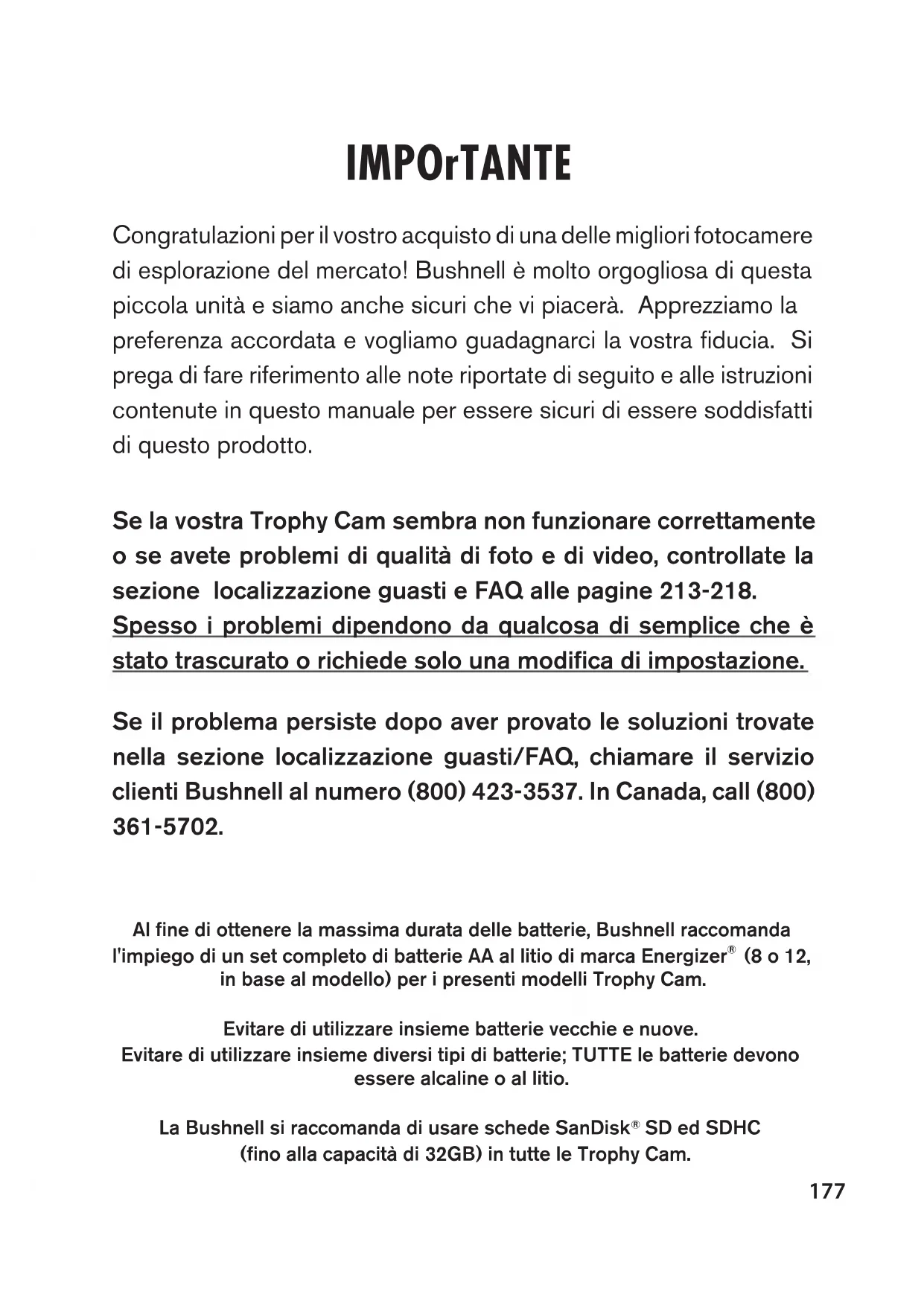 IMPOrTANTE Congratulazioni per il vostro acquisto di una delle migliori fotocamere di esplorazione del mercato! Bushnell è molto orgogliosa di questa piccola unità e siamo anche sicuri che vi piacerà. Apprezziamo la preferenza accordata e vogliamo guadagnarci la vostra fiducia. Si prega di fare riferimento alle note riportate di seguito e alle istruzioni contenute in questo manuale per essere sicuri di essere soddisfatti di questo prodotto. Se la vostra Trophy Cam sembra non funzionare correttamente o se avete problemi di qualità di foto e di video, controllate la sezione localizzazione guasti e FAQ alle pagine 213-218. Spesso i problemi dipendono da qualcosa di semplice che è stato trascurato o richiede solo una modifica di impostazione. Se il problema persiste dopo aver provato le soluzioni trovate nella sezione localizzazione guasti/FAQ, chiamare il servizio clienti Bushnell al numero (800) 423-3537. In Canada, call (800) 361-5702. Al fine di ottenere la massima durata delle batterie, Bushnell raccomanda l'impiego di un set completo di batterie AA al litio di marca Energizer