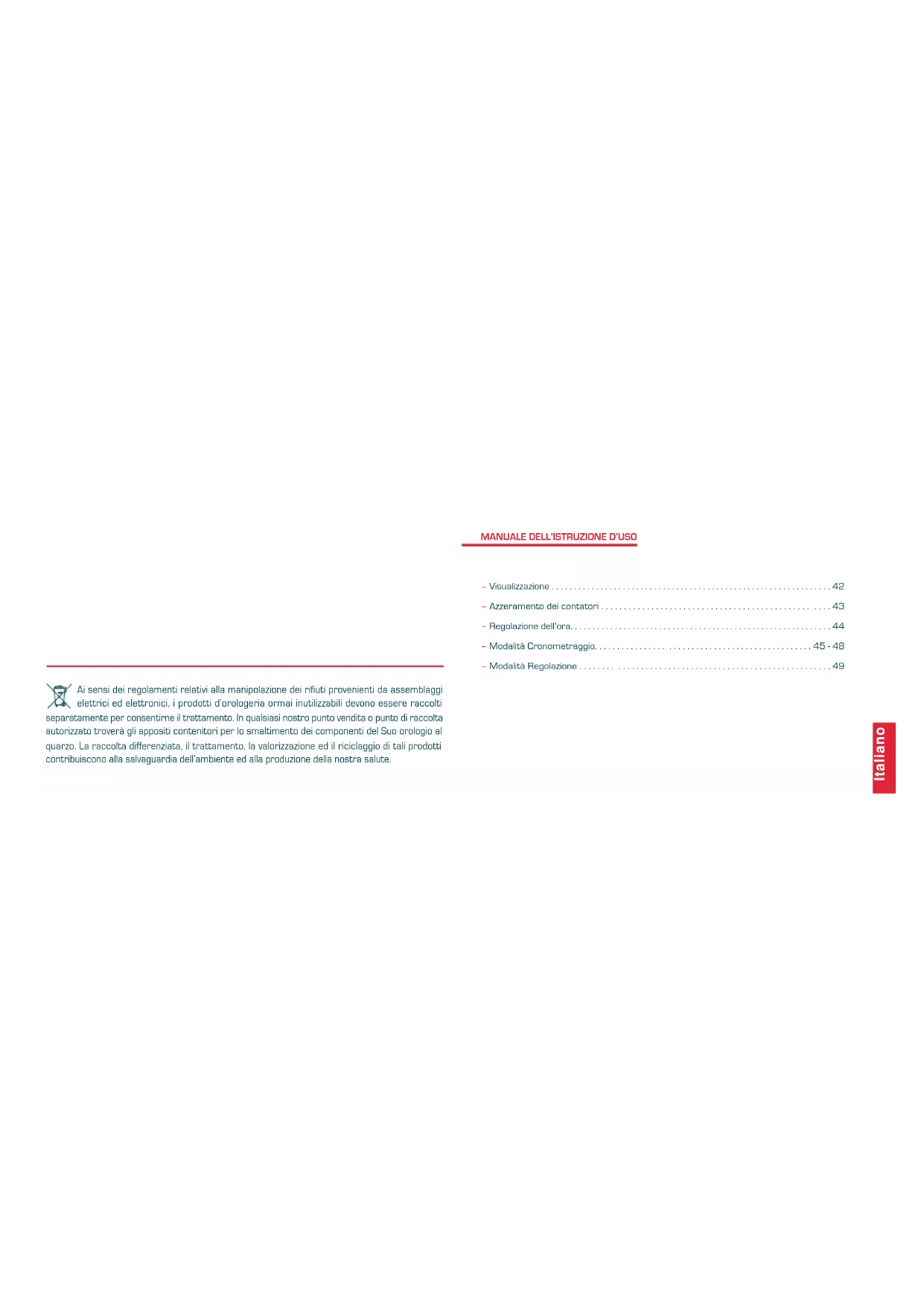 Ai sensi dei regolamenti relativi alla manipolazione dei rifiuti provenienti da assemblaggi elettrici ed elettronici, i prodotti d'arologeria ormai inutilizzabili devono essere raccolti separamente per consentire il trattamento. In qualsiasi nostro punto vendita o punto di raccolta autorizzato trovera gli apposti contentori per lo smaltimento dei componenti del Suor analogio al quarzo. La racolta differenziate, il trattamento, la valorizzazione ed il riciclaggio di tali prodotti contribuiscono alla salvaguardia dell'amiente ed alla produzione della nostra salute.