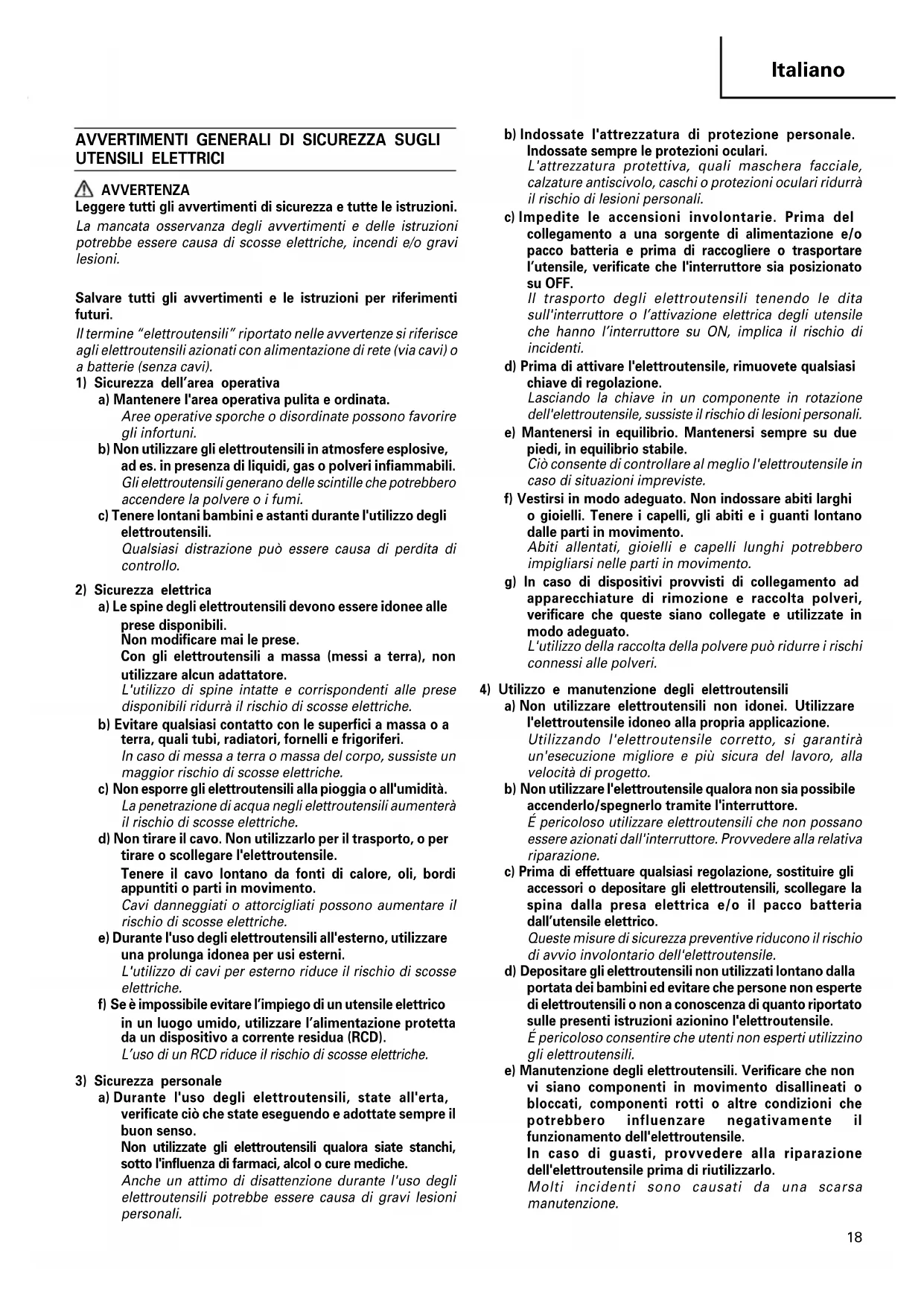 UTENSILI ELETTRICI AVVERTENZA Leggere tutti gli avvertimenti di sicurezza e tutte le istruzioni. La mancata osservanza degli avvertimenti e delle istruzioni potrebbe essere causa di scosse elettriche, incendi e/o gravi lesioni. Salvare tutti gli avvertimenti e le istruzioni per riferimenti futuri. Il termine “elettroutensili” riportato nelle avvertenze si riferisce agli elettroutensili azionati con alimentazione di rete (via cavi) o a batterie (senza cavi).
