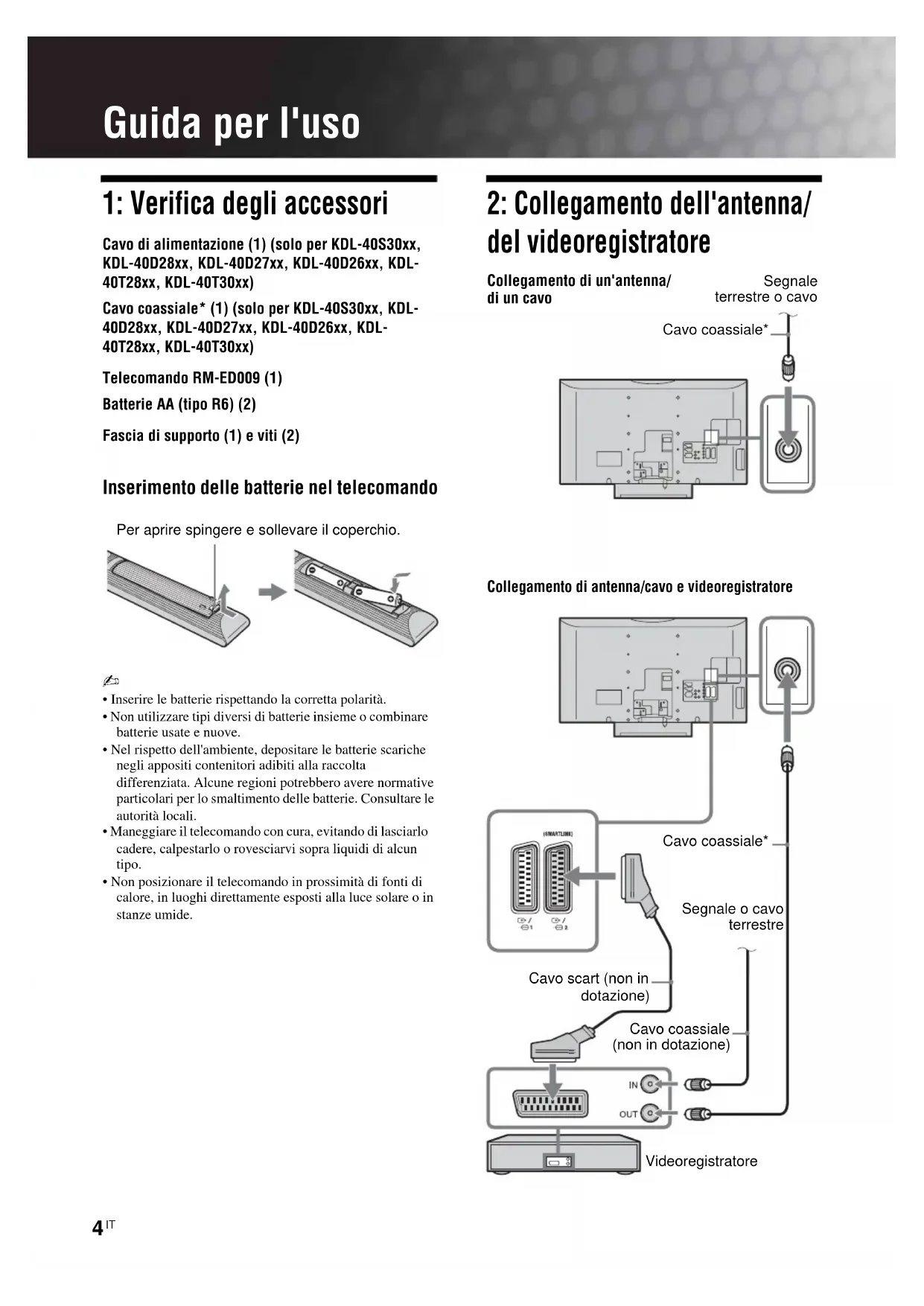 Guida per l'uso 1: Verifica degli accessori Cavo di alimentazione (1) (solo per KDL-40S30xx, KDL-40D28xx, KDL-40D27xx, KDL-40D26xx, KDL- 40T28xx, KDL-40T30xx) Cavo coassiale* (1) (solo per KDL-40S30xx, KDL- 40D28xx, KDL-40D27xx, KDL-40D26xx, KDL- 40T28xx, KDL-40T30xx) Telecomando RM-ED009 (1) Batterie AA (tipo R6) (2) Fascia di supporto (1) e viti (2) Inserimento delle batterie nel telecomando ~ • Inserire le batterie rispettando la corretta polarità.• Non utilizzare tipi diversi di batterie insieme o combinare batterie usate e nuove.• Nel rispetto dell'ambiente, depositare le batterie scariche negli appositi contenitori adibiti alla raccolta differenziata. Alcune regioni potrebbero avere normative particolari per lo smaltimento delle batterie. Consultare le autorità locali.• Maneggiare il telecomando con cura, evitando di lasciarlo cadere, calpestarlo o rovesciarvi sopra liquidi di alcun tipo.• Non posizionare il telecomando in prossimità di fonti di calore, in luoghi direttamente esposti alla luce solare o in stanze umide. 2: Collegamento dell'antenna/ del videoregistratore Per aprire spingere e sollevare il coperchio.