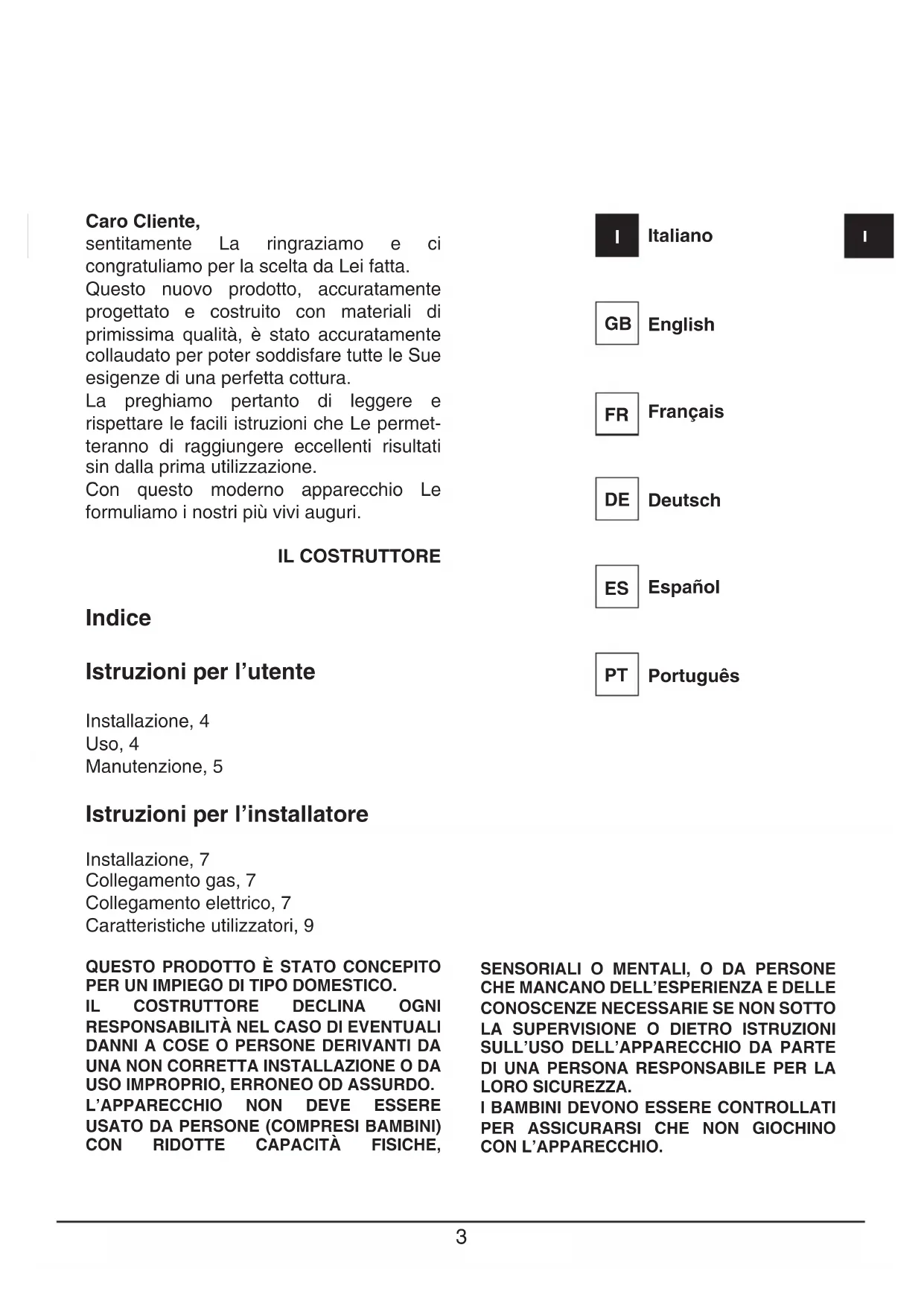 Indice Istruzioni per l’utente Installazione, 4 Uso, 4 Manutenzione, 5 Istruzioni per l’installatore Installazione, 7 Collegamento gas, 7 Collegamento elettrico, 7 Caratteristiche utilizzatori, 9 QUESTO PRODOTTO È STATO CONCEPITO PER UN IMPIEGO DI TIPO DOMESTICO.IL COSTRUTTORE DECLINA OGNI RESPONSABILITÀ NEL CASO DI EVENTUALI DANNI A COSE O PERSONE DERIVANTI DA UNA NON CORRETTA INSTALLAZIONE O DA USO IMPROPRIO, ERRONEO OD ASSURDO.L’APPARECCHIO NON DEVE ESSERE USATO DA PERSONE (COMPRESI BAMBINI) CON RIDOTTE CAPACITÀ FISICHE, SENSORIALI O MENTALI, O DA PERSONE CHE MANCANO DELL’ESPERIENZA E DELLE CONOSCENZE NECESSARIE SE NON SOTTO LA SUPERVISIONE O DIETRO ISTRUZIONI SULL’USO DELL’APPARECCHIO DA PARTE DI UNA PERSONA RESPONSABILE PER LA LORO SICUREZZA.I BAMBINI DEVONO ESSERE CONTROLLATI PER ASSICURARSI CHE NON GIOCHINO CON L’APPARECCHIO. Caro Cliente, sentitamente La ringraziamo e ci congratuliamo per la scelta da Lei fatta. Questo nuovo prodotto, accuratamente progettato e costruito con materiali di primissima qualità, è stato accuratamente collaudato per poter soddisfare tutte le Sue esigenze di una perfetta cottura. La preghiamo pertanto di leggere e rispettare le facili istruzioni che Le permet- teranno di raggiungere eccellenti risultati sin dalla prima utilizzazione. Con questo moderno apparecchio Le formuliamo i nostri più vivi auguri. IL COSTRUTTORE Italiano