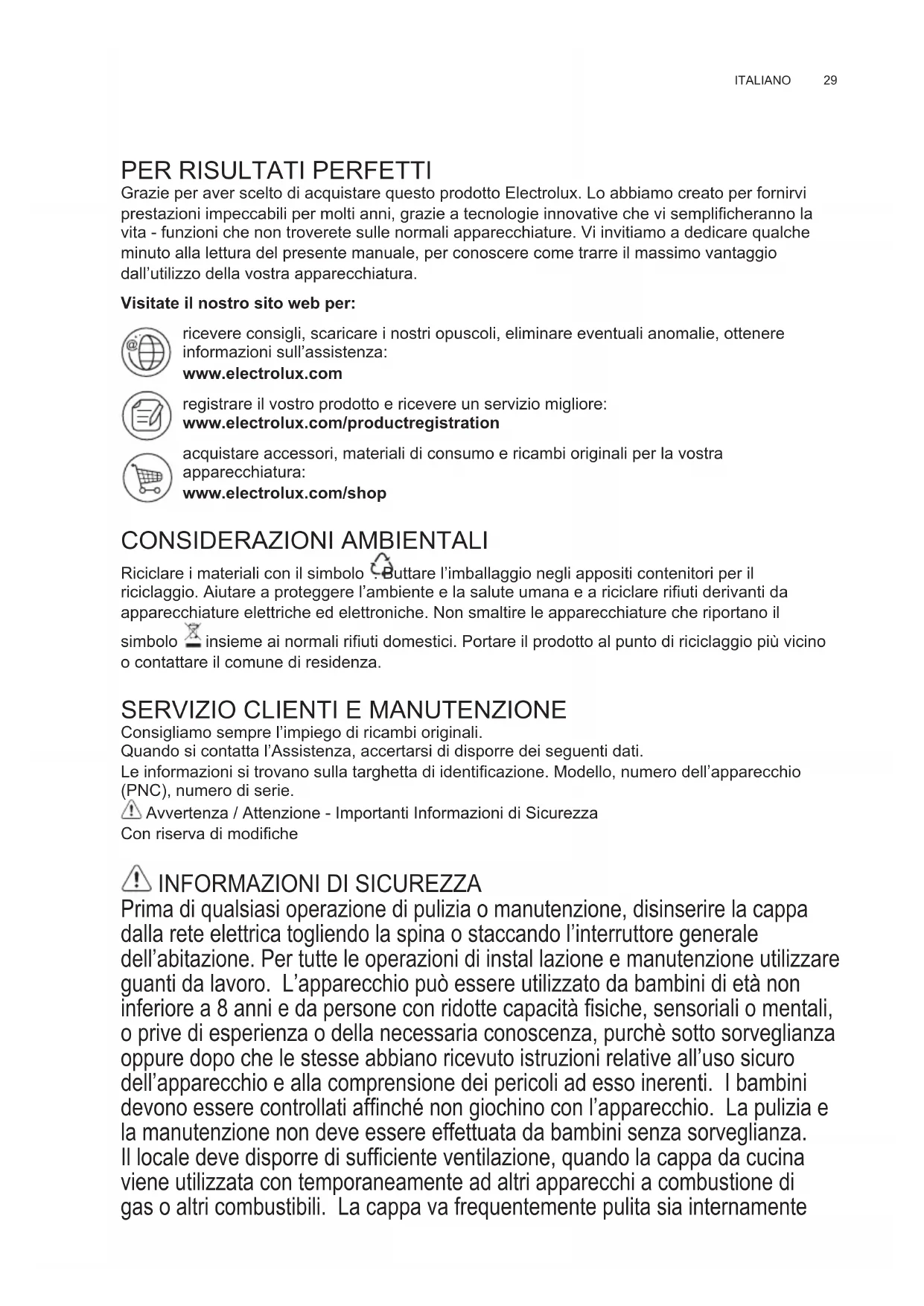 Prima di qualsiasi operazione di pulizia o manutenzione, disinserire la cappa dalla rete elettrica togliendo la spina o staccando l’interruttore generale dell’abitazione. Per tutte le operazioni di instal lazione e manutenzione utilizzare guanti da lavoro. L’apparecchio può essere utilizzato da bambini di età non inferiore a 8 anni e da persone con ridotte capacità siche, sensoriali o mentali, o prive di esperienza o della necessaria conoscenza, purchè sotto sorveglianza oppure dopo che le stesse abbiano ricevuto istruzioni relative all’uso sicuro dell’apparecchio e alla comprensione dei pericoli ad esso inerenti. I bambini devono essere controllati afnché non giochino con l’apparecchio. La pulizia e la manutenzione non deve essere effettuata da bambini senza sorveglianza. Il locale deve disporre di sufciente ventilazione, quando la cappa da cucina viene utilizzata con temporaneamente ad altri apparecchi a combustione di gas o altri combustibili. La cappa va frequentemente pulita sia internamente IT LIBRETTO DI USOwww.electrolux.com