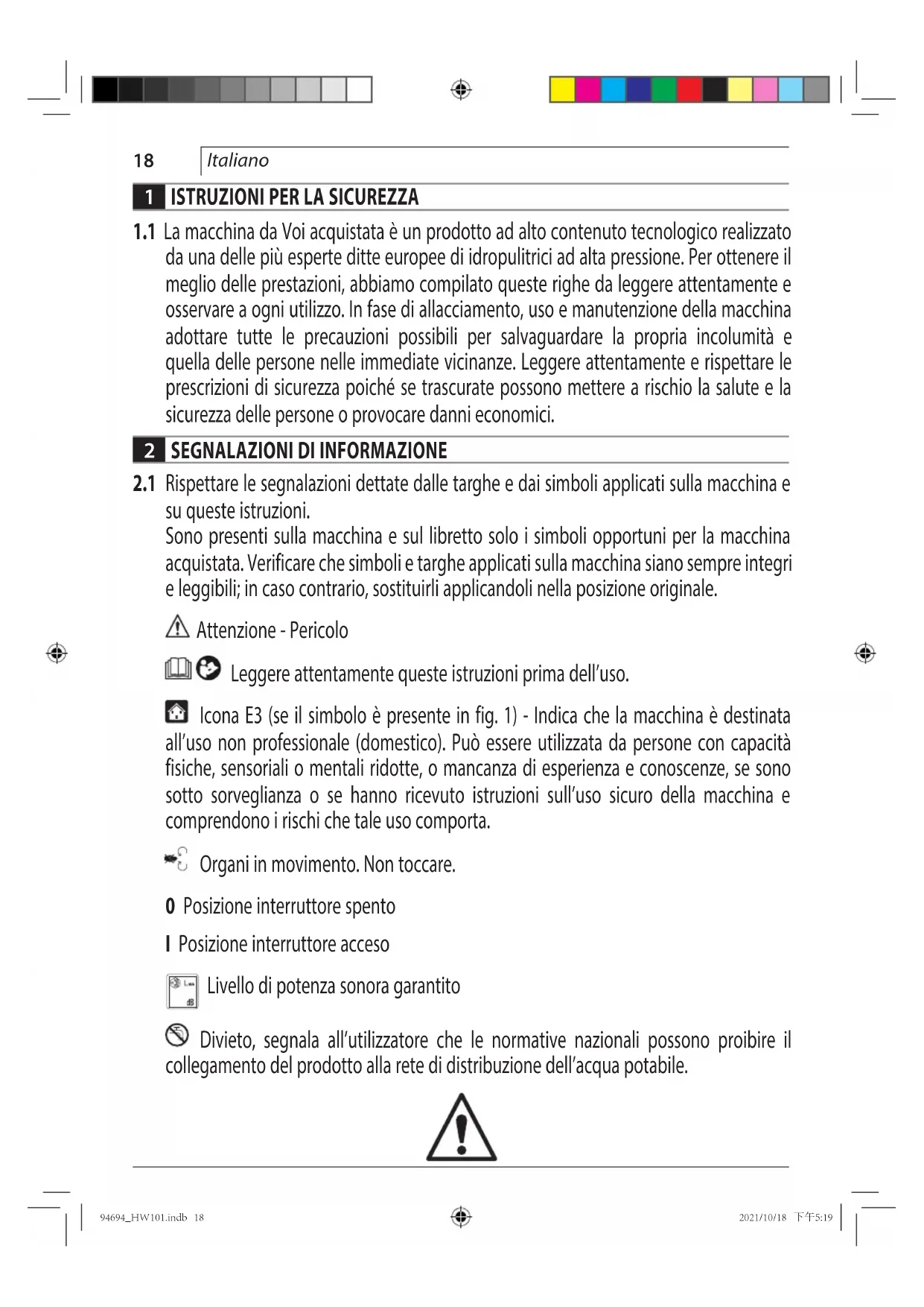 su queste istruzioni. Sono presenti sulla macchina e sul libretto solo i simboli opportuni per la macchina acquistata. Verificare che simboli e targhe applicati sulla macchina siano sempre integri e leggibili; in caso contrario, sostituirli applicandoli nella posizione originale. Attenzione - Pericolo Leggere attentamente queste istruzioni prima dell’uso. Icona E3 (se il simbolo è presente in fig. 1) - Indica che la macchina è destinata all’uso non professionale (domestico). Può essere utilizzata da persone con capacità fisiche, sensoriali o mentali ridotte, o mancanza di esperienza e conoscenze, se sono sotto sorveglianza o se hanno ricevuto istruzioni sull’uso sicuro della macchina e comprendono i rischi che tale uso comporta. Organi in movimento. Non toccare. 0 Posizione interruttore spento I Posizione interruttore acceso Livello di potenza sonora garantito Divieto, segnala all’utilizzatore che le normative nazionali possono proibire il collegamento del prodotto alla rete di distribuzione dell’acqua potabile. 94694_HW101.indb 1894694_HW101.indb 18 2021/10/18 下午5:192021/10/18 下午5:1919 Italiano Segnale di pericolo, segnala all’utilizzatore di non indirizzare il getto d’acqua verso persone, animali, equipaggiamenti elettrici o verso il prodotto stesso. Questo prodotto è di classe di isolamento II. Ciò significa che è equipaggiato con un isolamento rinforzato o con un doppio isolamento (solo se il simbolo è presente sulla macchina). Questo prodotto è conforme con le direttive Europee applicabili in materia. Icona E1 - Indica l’obbligo di non smaltire la macchina come rifiuto urbano; può essere riconsegnata al distributore all’atto dell’acquisto di una macchina nuova. Le parti elettriche ed elettroniche costituenti la macchina non devono essere riutilizzate per usi impropri per la presenza di sostanze dannose alla salute. Solo per le nazioni dell’EU A causa della presenza di componenti pericolosi nelle apparecchiature, le apparecchiature elettriche ed elettroniche usate potrebbero produrre un impatto negativo sull’ambiente e sulla salute umana. Non smaltire elettrodomestici elettrici ed elettronici insieme ai rifiuti domestici! In conformità alla direttiva europea sui rifiuti di apparecchiature elettriche ed elettroniche (RAEE), e al suo adattamento alle normative nazionali, le apparecchiature elettriche ed elettroniche usate vanno sottoposte a raccolta differenziata e conferite a un punto di raccolta separato per i rifiuti comunali, operando in conformità alle normative per la protezione dell’ambiente. Tale requisito viene indicato mediante il simbolo del bidone della spazzatura con ruote barrato apposto sull’apparecchio. Utilizzare cuffie di protezione. Utilizzare maschera di protezione. Utilizzare dispositivi di protezione dell’apparato respiratorio. Utilizzare guanti protettivi. Utilizzare scarpe antiinfortunistiche. Utilizzare abbigliamento di protezione. 94694_HW101.indb 1994694_HW101.indb 19 2021/10/18 下午5:192021/10/18 下午5:1920 Italiano