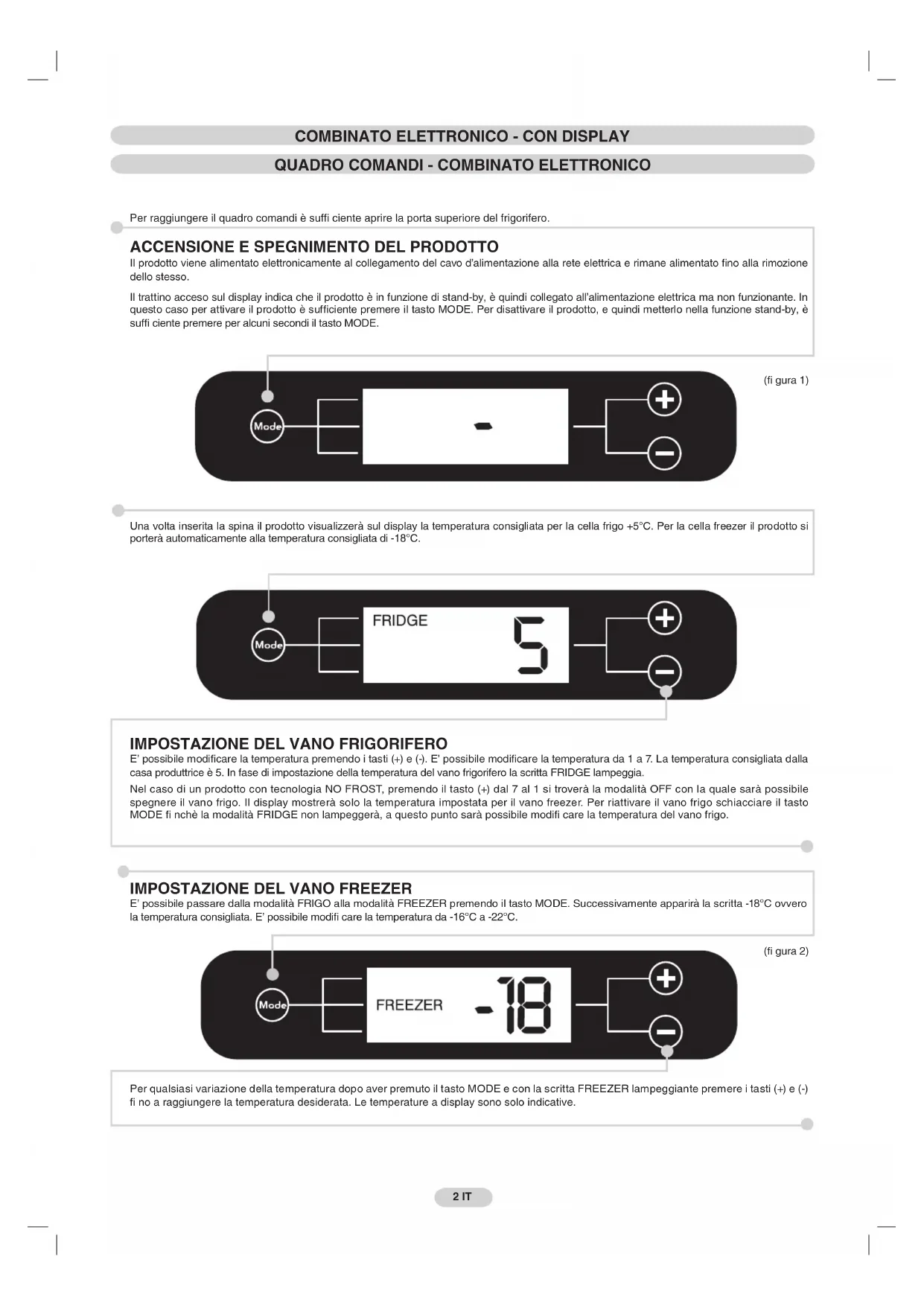 E’ possibile passare dalla modalità FRIGO alla modalità FREEZER premendo il tasto MODE. Successivamente apparirà la scritta -18°C ovvero la temperatura consigliata. E’ possibile modifi care la temperatura da -16°C a -22°C. Per qualsiasi variazione della temperatura dopo aver premuto il tasto MODE e con la scritta FREEZER lampeggiante premere i tasti (+) e (-) fi no a raggiungere la temperatura desiderata. Le temperature a display sono solo indicative. (fi gura 1) (fi gura 2) 2 IT 2 IT Una volta inserita la spina il prodotto visualizzerà sul display la temperatura consigliata per la cella frigo +5°C. Per la cella freezer il prodotto si porterà automaticamente alla temperatura consigliata di -18°C.3 IT 3 IT OPZIONE SUPERCONGELAZIONE / OPZIONE SUPER - COMBINATO ELETTRONICO OPZIONE SUPERGUASTI ED ERRORI - COMBINATO ELETTRONICO Ogni errore o guasto verrà segnalato automaticamente dal display che indicherà un numero preceduto dalla lettera „E” (Errore). In questo caso provare a spegnere e riaccendere il prodotto. Se l’errore si ripresenta contattare l’assistenza tecnica. Nel caso di prodotti con tecnologia NO FROST, dopo un black-out sul display apparirà la scritta „PF” (Power Fail). In caso di mancanza di corrente superiore alle 10-12 ore controllare che gli alimenti siano rimasti inalterati per consumarli entro 24 ore o procedere alla loro cottura e successivo congelamento. (fi gura 4) (fi gura 5) (fi gura 3) Disattivo Attivo Prodotti ELETTRONICI senza tecnologia NO FROST: premere il tasto (+) per attivare la funzione SUPER. Disporre i cibi da congelare nel vano freezer. Al termine del tempo prestabilito il prodotto uscirà automaticamente dalla funzione SUPER. Nel caso si voglia interrompere prima la funzione SUPER premere il tasto (-). Prodotti ELETTRONICI con tecnologia NO FROST: premere il tasto (+) per attivare la funzione SUPER. Trascorse 8 ore disporre i cibi da congelare nel vano freezer. Al termine del tempo prestabilito il prodotto uscirà automaticamente dalla funzione SUPER. Nel caso si voglia interrompere prima la funzione SUPER, premere il tasto (-). La quantità massima di alimenti che è possibile congelare è indicata nella targhetta matricola (vedi fi gura 6). Premere più volte il tasto MODE fi no a che apparirà la scritta SUPER lampeggiante. In caso di mancanza di corrente superiore alle 10-12 ore controllare che gli alimenti siano rimasti inalterati per consumarli entro 24 ore o procedere alla loro cottura e successivo congelamento.
