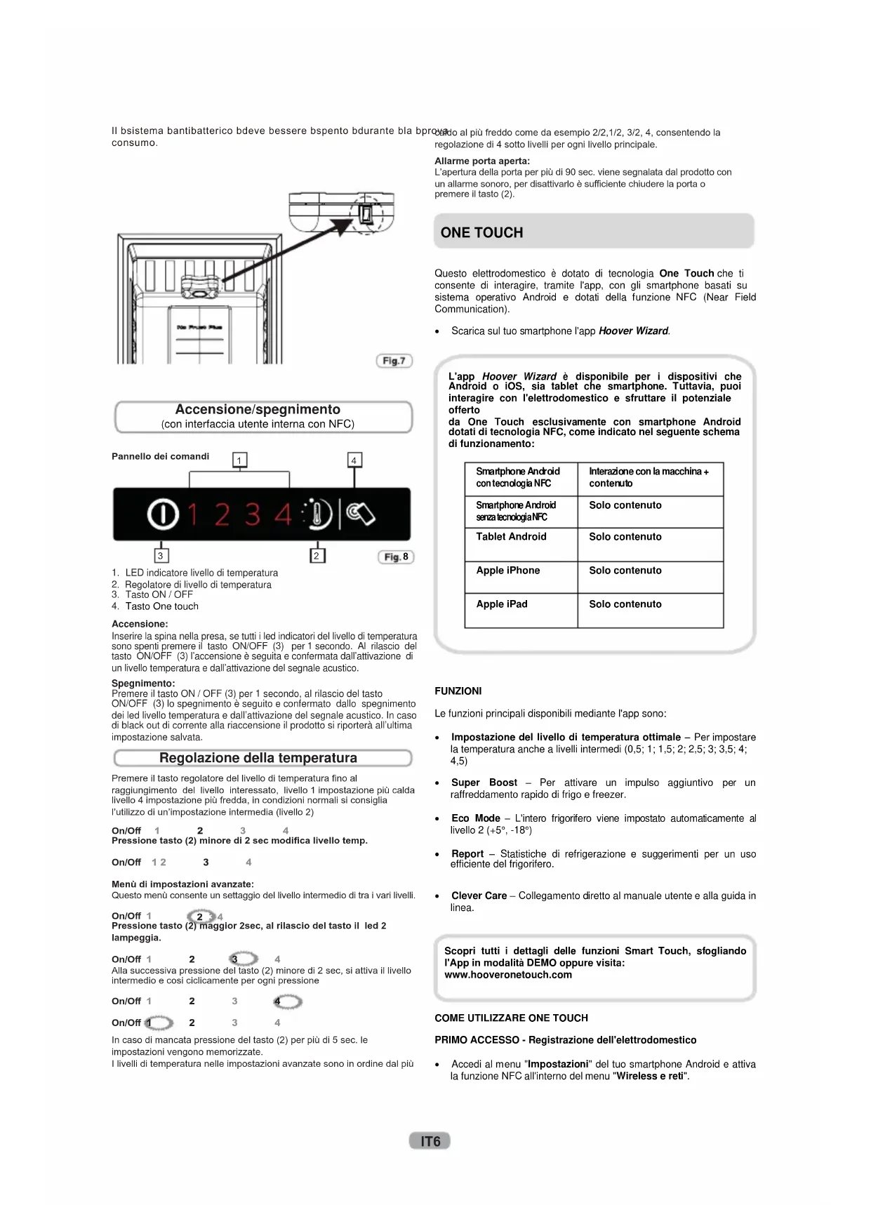 livello 4 impostazione più fredda, in condizioni normali si consiglia l’utilizzo di un’impostazione intermedia (livello 2)In caso di mancata pressione del tasto (2) per più di 5 sec. le impostazioni vengono memorizzate.I livelli di temperatura nelle impostazioni avanzate sono in ordine dal più On/O 1 2 3 4 Pressione tasto (2) minore di 2 sec modifica livello temp.On/O 1 2 3 4Menù di impostazioni avanzate:Questo menù consente un settaggio del livello intermedio di tra i vari livelli.On/O 1 2 3 4 Pressione tasto (2) maggior 2sec, al rilascio del tasto il led 2 lampeggia.On/O 1 2 3 4 Alla successiva pressione del tasto (2) minore di 2 sec, si attiva il livello intermedio e cosi ciclicamente per ogni pressioneOn/O 1 2 3 4On/O 1 2 3 4 Regolazione della temperatura caldo al più freddo come da esempio 2/2,1/2, 3/2, 4, consentendo la regolazione di 4 sotto livelli per ogni livello principale.Allarme porta aperta:L’apertura della porta per più di 90 sec. viene segnalata dal prodotto con un allarme sonoro, per disattivarlo è suciente chiudere la porta o premere il tasto (2). (con interfaccia utente interna con NFC) IT6 Questo elettrodomestico è dotato di tecnologia One Touch che ti consente di interagire, tramite l'app, con gli smartphone basati su sistema operativo Android e dotati della funzione NFC (Near Field Communication). Scarica sul tuo smartphone l'app Hoover Wizard. FUNZIONI Le funzioni principali disponibili mediante l'app sono: Impostazione del livello di temperatura ottimale – Per impostare la temperatura anche a livelli intermedi (0,5; 1; 1,5; 2; 2,5; 3; 3,5; 4; 4,5) Super Boost – Per attivare un impulso aggiuntivo per un raffreddamento rapido di frigo e freezer. Eco Mode – L'intero frigorifero viene impostato automaticamente al livello 2 (+5°, -18°) Report – Statistiche di refrigerazione e suggerimenti per un uso efficiente del frigorifero. Clever Care – Collegamento diretto al manuale utente e alla guida in linea.