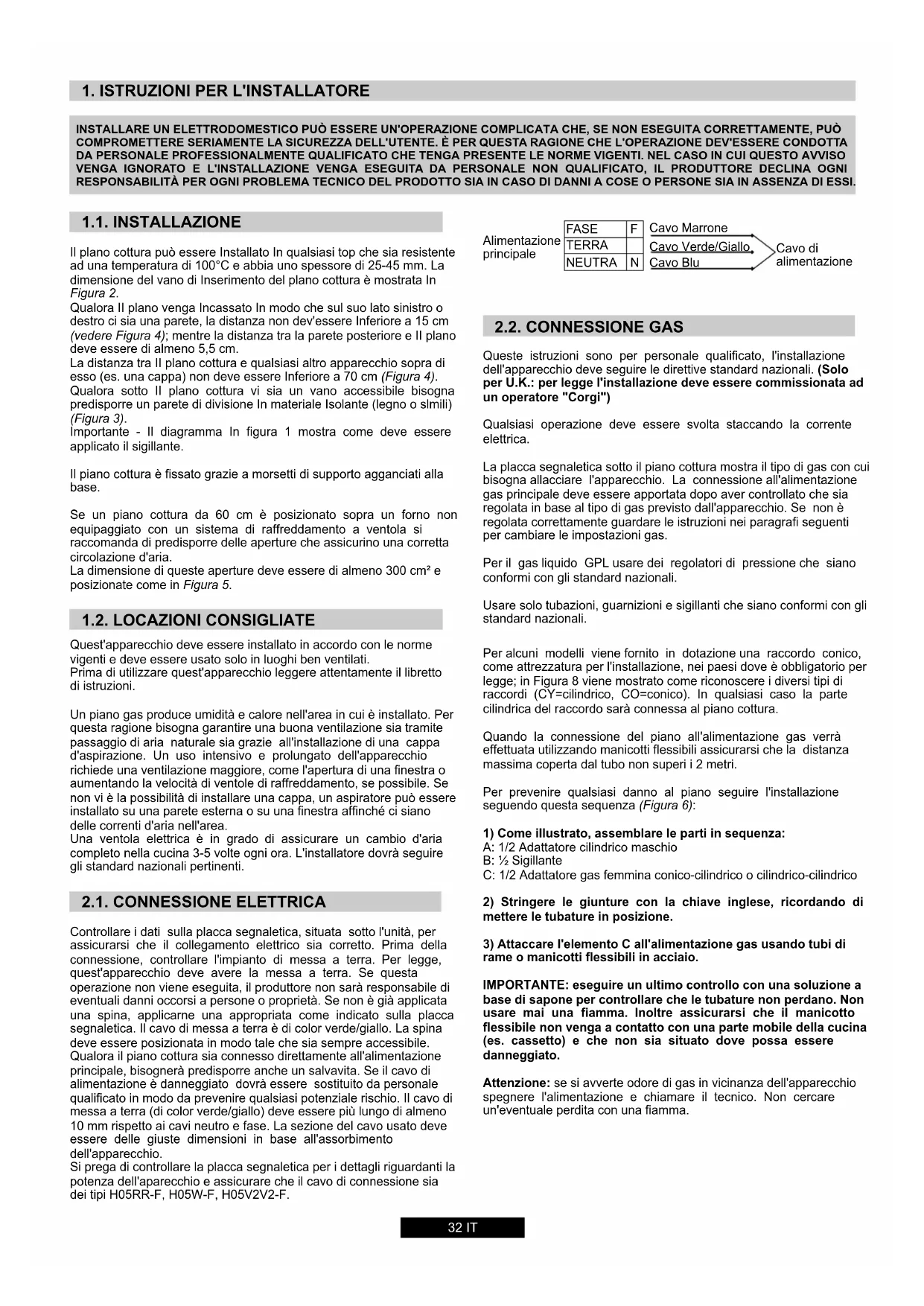 1.1. Installazione 1.2. Locazioni Consigliate 2.1. Connessione Elettrica 2.2. Connessione Gas 2.3. Adattare Il Piano Cottura Con Diversi Tipi Di Gas 2.4. Regolare Il Minimo Della Fiamma