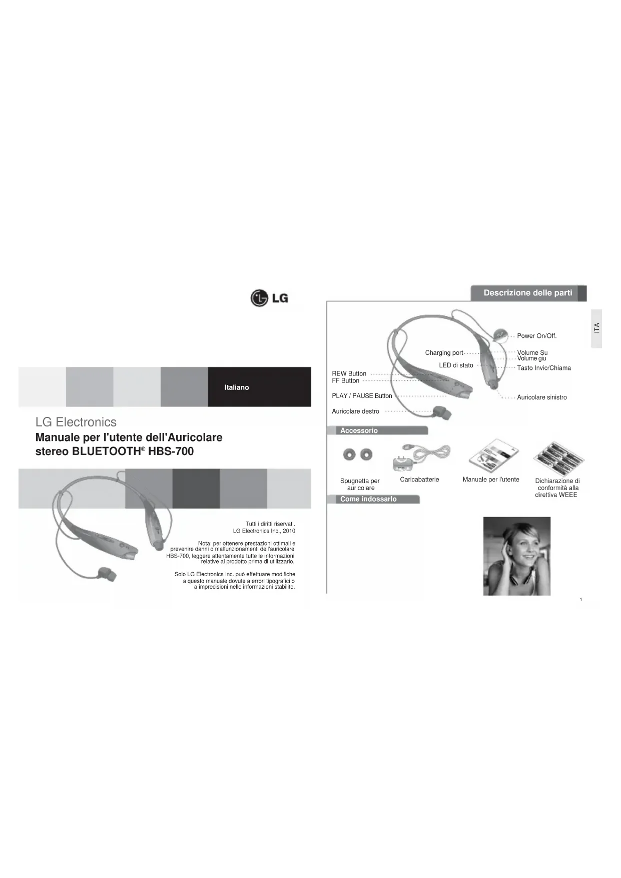 ITA Caricabatterie Spugnetta per auricolare Manuale per l'utente Dichiarazione di conformità alla direttiva WEEE Volume giu REW Button Power On/Off. Tasto Invio/Chiama Volume Su LED di stato Auricolare sinistro Charging port PLAY / PAUSE Button FF Button Auricolare destro Accessorio3 Ricarica dell'auricolare Specifiche Impostazioni audioACCENSIONEBLUETOOTHImpostazioni displayTelefonoImpostazioni di chiamata IMPOSTAZIONI SELEZIONA LG HBS-700 DISPOSITIVI RILEVATI SELEZIONA Passkey: