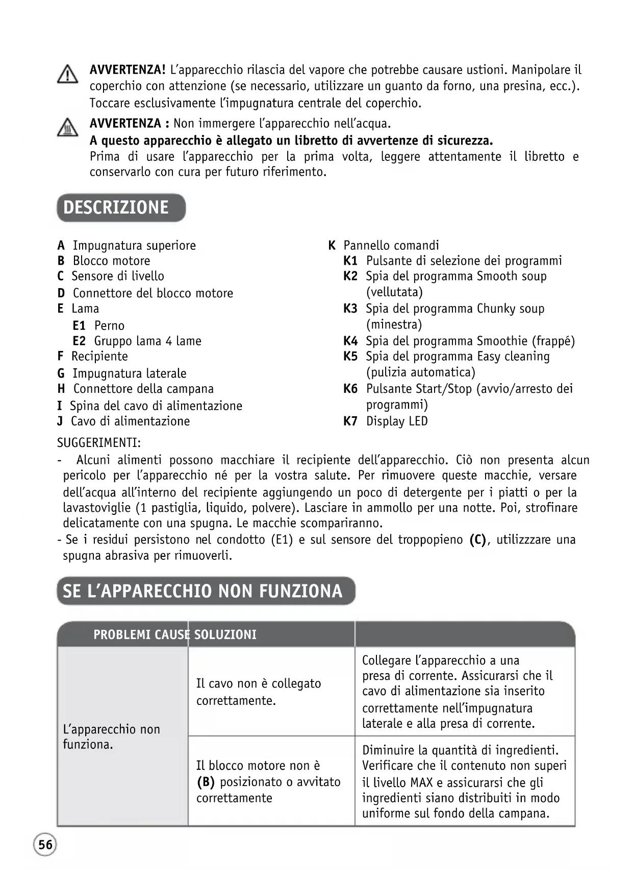 L’apparecchio non funziona. Il cavo non è collegato correttamente. Collegare l’apparecchio a una presa di corrente. Assicurarsi che il cavo di alimentazione sia inserito correttamente nell’impugnatura laterale e alla presa di corrente. Il blocco motore non è (B) posizionato o avvitato correttamente Diminuire la quantità di ingredienti. Verificare che il contenuto non superi il livello MAX e assicurarsi che gli ingredienti siano distribuiti in modo uniforme sul fondo della campana. DESCRIZIONE A Impugnatura superiore B Blocco motore C Sensore di livello D Connettore del blocco motore E Lama E1 Perno E2 Gruppo lama 4 lame F Recipiente G Impugnatura laterale H Connettore della campana I Spina del cavo di alimentazione J Cavo di alimentazione K Pannello comandi K1 Pulsante di selezione dei programmi K2 Spia del programma Smooth soup (vellutata) K3 Spia del programma Chunky soup (minestra) K4 Spia del programma Smoothie (frappé) K5 Spia del programma Easy cleaning (pulizia automatica) K6 Pulsante Start/Stop (avvio/arresto dei programmi) K7 Display LED SUGGERIMENTI: - Alcuni alimenti possono macchiare il recipiente dell’apparecchio. Ciò non presenta alcun pericolo per l’apparecchio né per la vostra salute. Per rimuovere queste macchie, versare dell’acqua all’interno del recipiente aggiungendo un poco di detergente per i piatti o per la lavastoviglie (1 pastiglia, liquido, polvere). Lasciare in ammollo per una notte. Poi, strofinare delicatamente con una spugna. Le macchie scompariranno. - Se i residui persistono nel condotto (E1) e sul sensore del troppopieno (C), utilizzzare una spugna abrasiva per rimuoverli. AVVERTENZA! L’apparecchio rilascia del vapore che potrebbe causare ustioni. Manipolare il coperchio con attenzione (se necessario, utilizzare un guanto da forno, una presina, ecc.). Toccare esclusivamente l’impugnatura centrale del coperchio. AVVERTENZA : Non immergere l’apparecchio nell’acqua. A questo apparecchio è allegato un libretto di avvertenze di sicurezza. Prima di usare l’apparecchio per la prima volta, leggere attentamente il libretto e conservarlo con cura per futuro riferimento.57