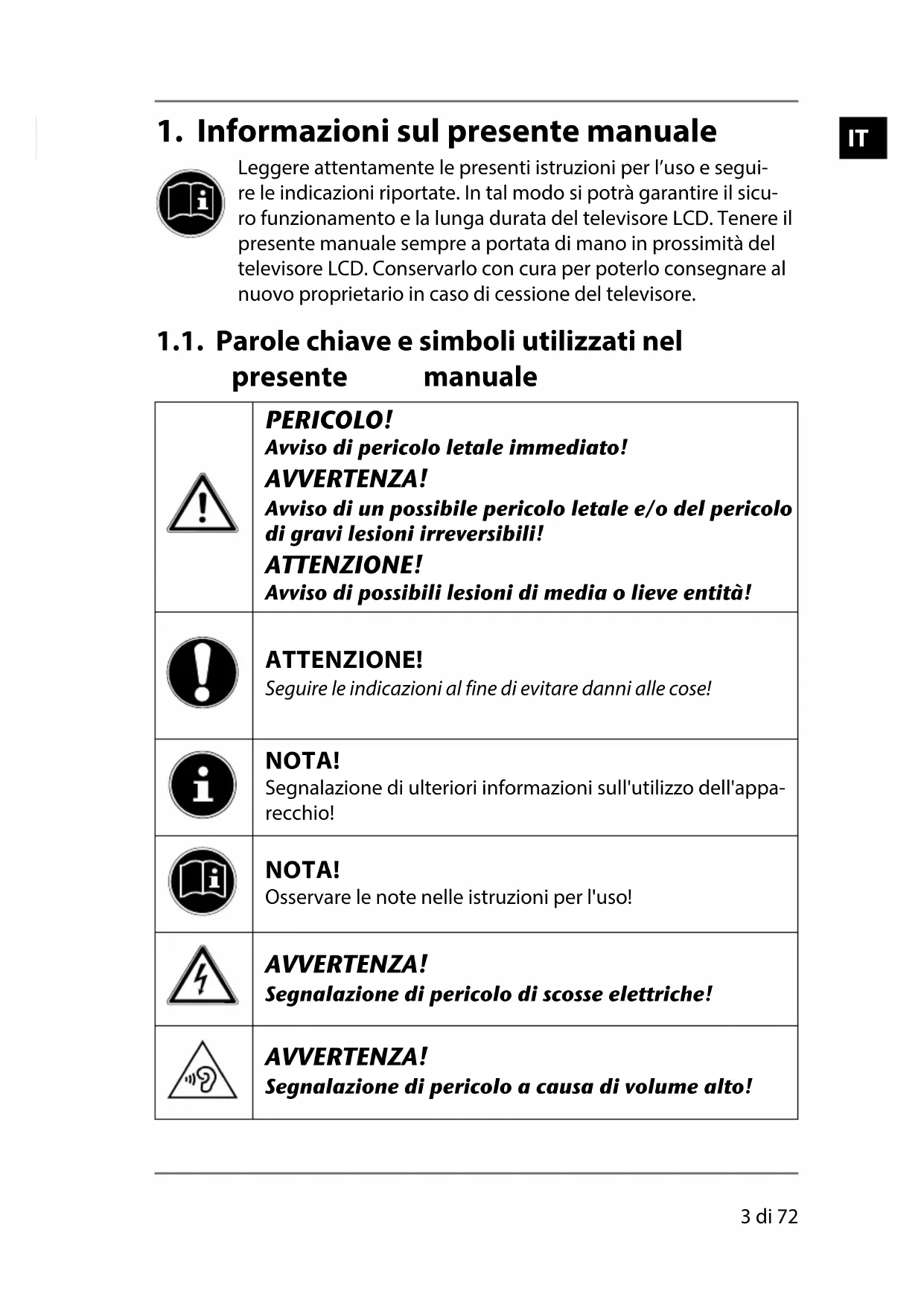 Leggere attentamente le presenti istruzioni per l’uso e segui- re le indicazioni riportate. In tal modo si potrà garantire il sicu- ro funzionamento e la lunga durata del televisore LCD. Tenere il presente manuale sempre a portata di mano in prossimità del televisore LCD. Conservarlo con cura per poterlo consegnare al nuovo proprietario in caso di cessione del televisore. 1.1. Parole chiave e simboli utilizzati nel presente manuale PERICOLO! Avviso di pericolo letale immediato! AVVERTENZA! Avviso di un possibile pericolo letale e/o del pericolo di gravi lesioni irreversibili! ATTENZIONE! Avviso di possibili lesioni di media o lieve entità! ATTENZIONE! Seguire le indicazioni al fine di evitare danni alle cose! NOTA! Segnalazione di ulteriori informazioni sull'utilizzo dell'appa- recchio! NOTA! Osservare le note nelle istruzioni per l'uso! AVVERTENZA! Segnalazione di pericolo di scosse elettriche! AVVERTENZA! Segnalazione di pericolo a causa di volume alto!4 di 72