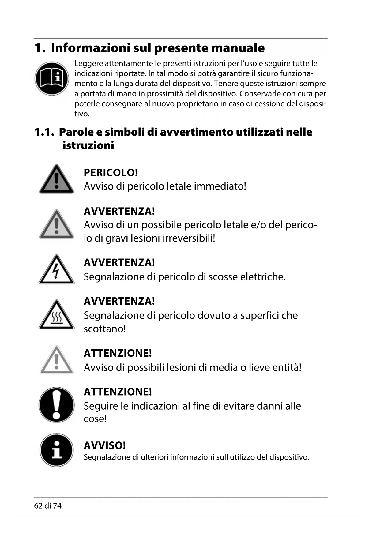 Leggere attentamente le presenti istruzioni per l’uso e seguire tutte le indicazioni riportate. In tal modo si potrà garantire il sicuro funziona- mento e la lunga durata del dispositivo. Tenere queste istruzioni sempre a portata di mano in prossimità del dispositivo. Conservarle con cura per poterle consegnare al nuovo proprietario in caso di cessione del disposi- tivo. 1.1. Parole e simboli di avvertimento utilizzati nelle istruzioni PERICOLO! Avviso di pericolo letale immediato! AVVERTENZA! Avviso di un possibile pericolo letale e/o del perico- lo di gravi lesioni irreversibili! AVVERTENZA! Segnalazione di pericolo di scosse elettriche. AVVERTENZA! Segnalazione di pericolo dovuto a superfici che scottano! ATTENZIONE! Avviso di possibili lesioni di media o lieve entità! ATTENZIONE! Seguire le indicazioni al fine di evitare danni alle cose! AVVISO! Segnalazione di ulteriori informazioni sull'utilizzo del dispositivo.DE