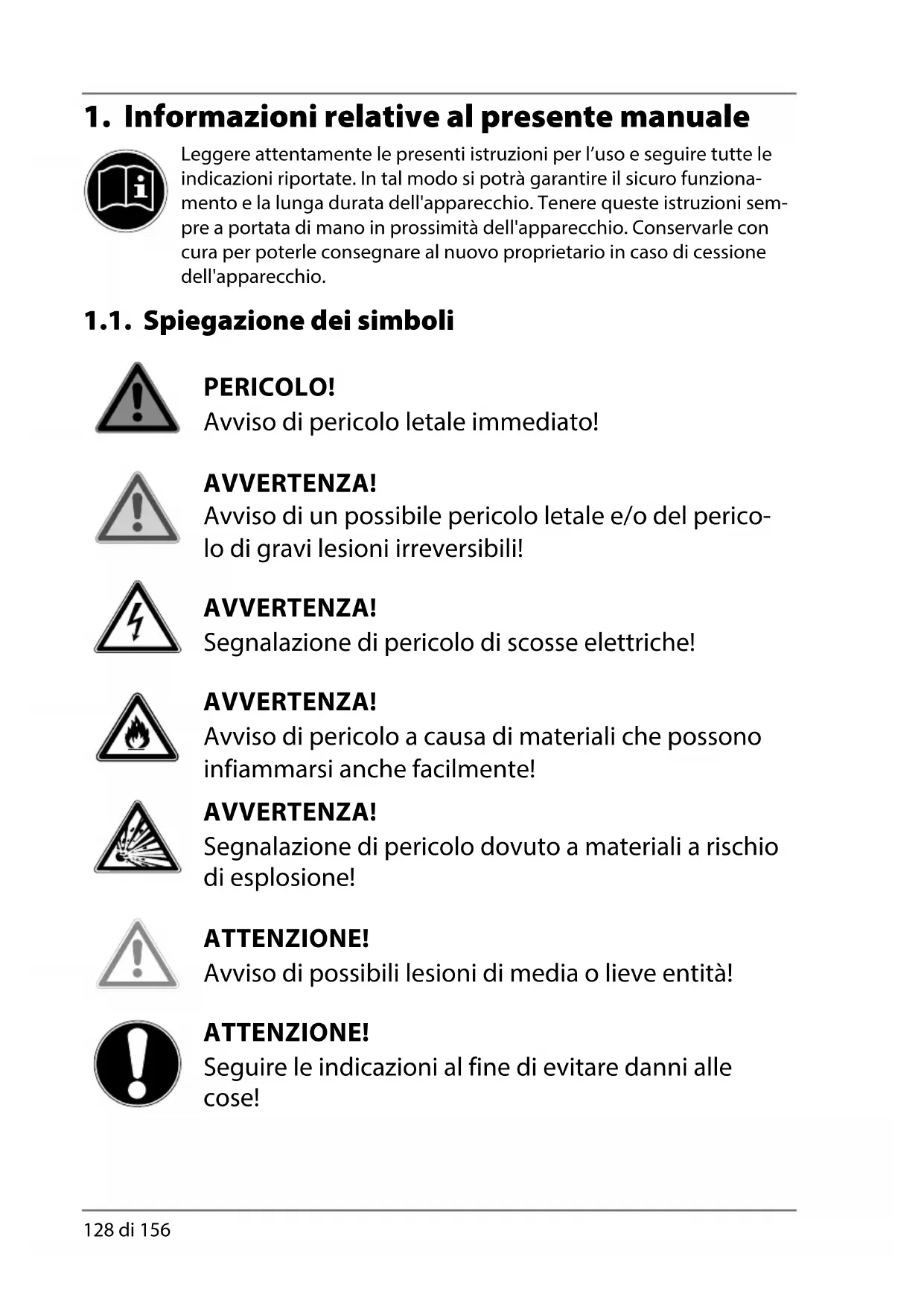 19. Note legali ................................................................................................ 1561. Informazioni relative al presente manuale Leggere attentamente le presenti istruzioni per l’uso e seguire tutte le indicazioni riportate. In tal modo si potrà garantire il sicuro funziona- mento e la lunga durata dell'apparecchio. Tenere queste istruzioni sem- pre a portata di mano in prossimità dell'apparecchio. Conservarle con cura per poterle consegnare al nuovo proprietario in caso di cessione dell'apparecchio. 1.1. Spiegazione dei simboli PERICOLO! Avviso di pericolo letale immediato! AVVERTENZA! Avviso di un possibile pericolo letale e/o del perico- lo di gravi lesioni irreversibili! AVVERTENZA! Segnalazione di pericolo di scosse elettriche! AVVERTENZA! Avviso di pericolo a causa di materiali che possono infiammarsi anche facilmente! AVVERTENZA! Segnalazione di pericolo dovuto a materiali a rischio di esplosione! ATTENZIONE! Avviso di possibili lesioni di media o lieve entità! ATTENZIONE! Seguire le indicazioni al fine di evitare danni alle cose! 128 di 156AVVISO! Ulteriori informazioni sull'utilizzo dell'apparecchio! AVVISO! Osservare gli avvisi nelle istruzioni per l'uso!