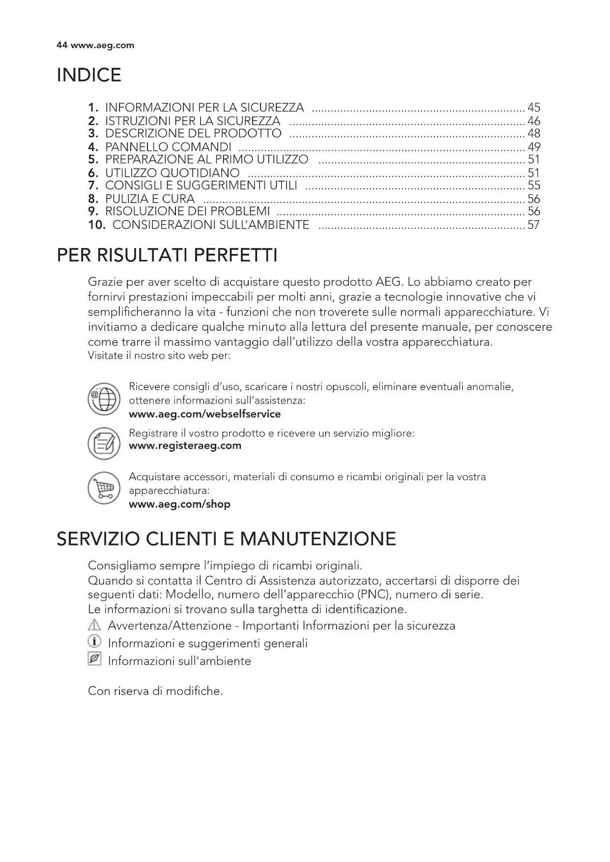 Ricevere consigli d’uso, scaricare i nostri opuscoli, eliminare eventuali anomalie, ottenere informazioni sull’assistenza: www.aeg.com/webselfservice Registrare il vostro prodotto e ricevere un servizio migliore: www.registeraeg.com Acquistare accessori, materiali di consumo e ricambi originali per la vostra apparecchiatura: www.aeg.com/shop