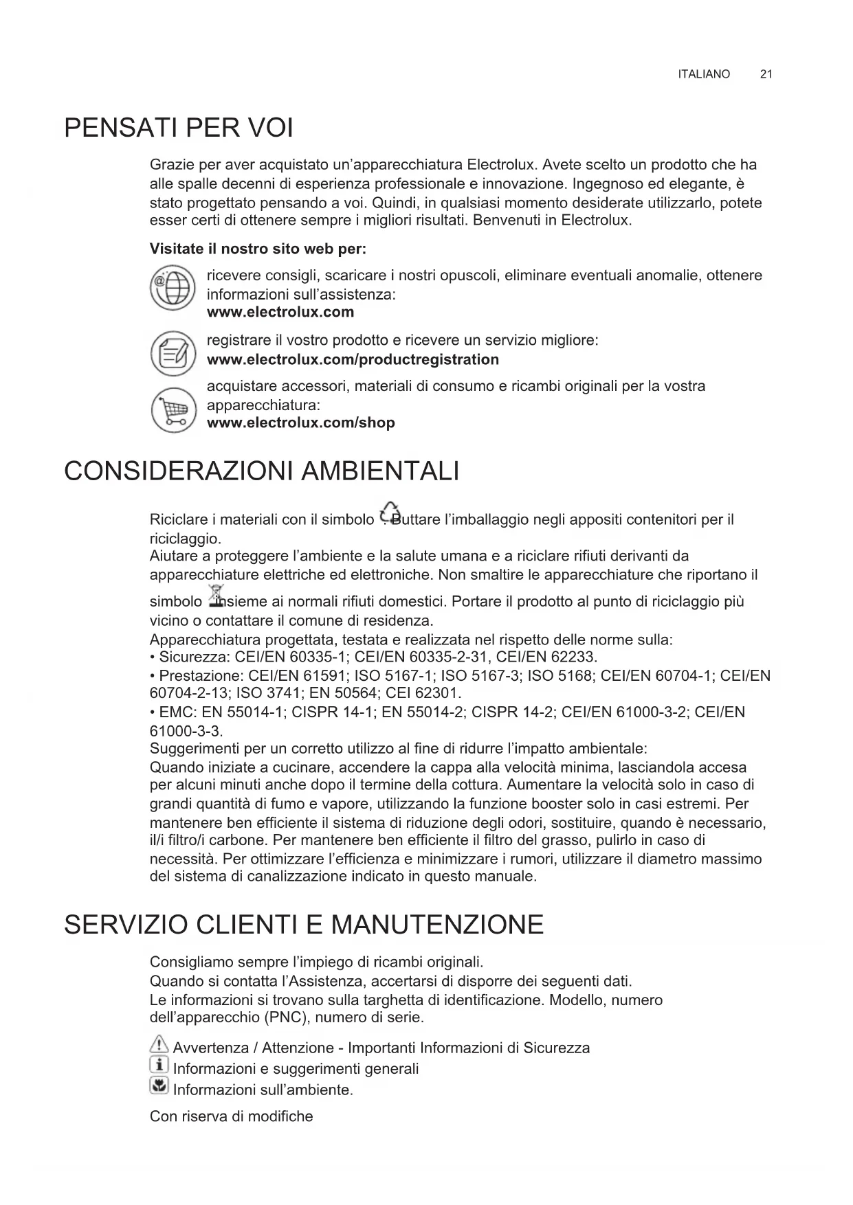 Consigliamo sempre l’impiego di ricambi originali. Quando si contatta l’Assistenza, accertarsi di disporre dei seguenti dati. Le informazioni si trovano sulla targhetta di identificazione. Modello, numero dell’apparecchio (PNC), numero di serie. Avvertenza / Attenzione - Importanti Informazioni di Sicurezza Informazioni e suggerimenti generali Informazioni sull’ambiente. Con riserva di modifiche IT LIBRETTO DI USOwww.electrolux.com