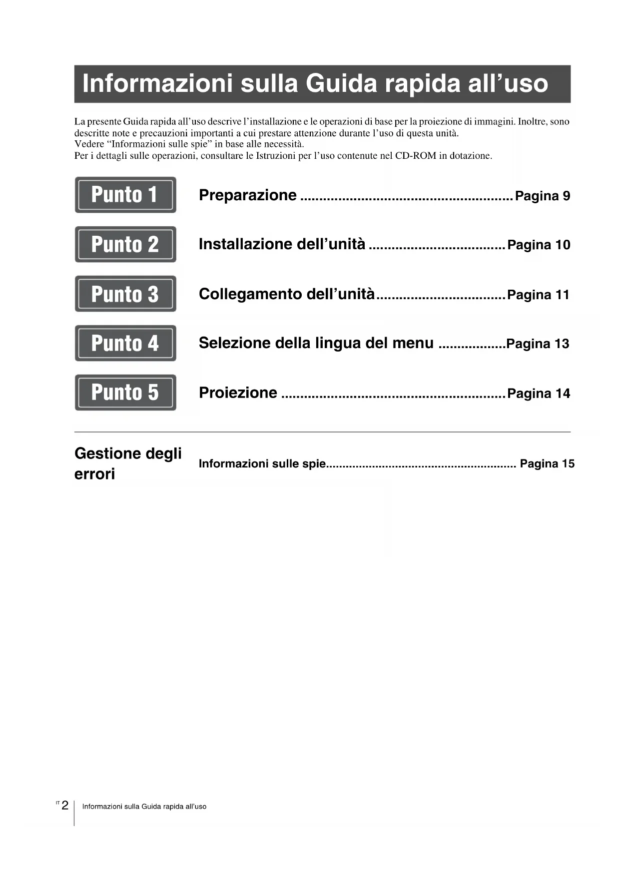 La presente Guida rapida all’uso descrive l’installazione e le operazioni di base per la proiezione di immagini. Inoltre, sono descritte note e precauzioni importanti a cui prestare attenzione durante l’uso di questa unità.Vedere “Informazioni sulle spie” in base alle necessità.Per i dettagli sulle operazioni, consultare le Istruzioni per l’uso contenute nel CD-ROM in dotazione. Informazioni sulla Guida rapida all’uso Preparazione ........................................................Pagina 9 Installazione dell’unità ....................................Pagina 10 Collegamento dell’unità..................................Pagina 11 Selezione della lingua del menu ..................Pagina 13 Proiezione ...........................................................Pagina 14 Gestione degli errori Informazioni sulle spie.......................................................... Pagina 15 Punto 1 Punto 2 Punto 3 Punto 4 Punto 5AVVERTENZA