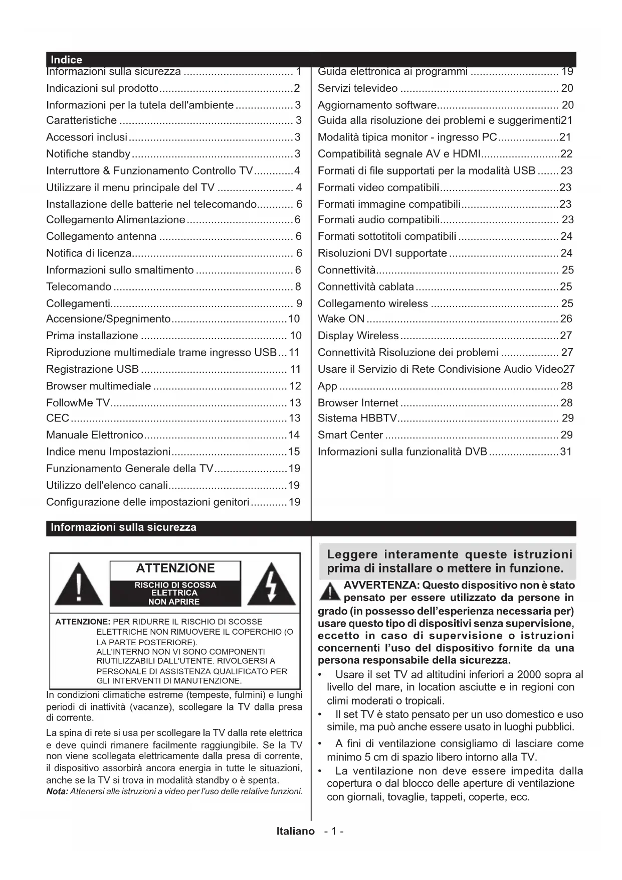 GLI INTERVENTI DI MANUTENZIONE. Nota: Attenersi alle istruzioni a video per l'uso delle relative funzioni. In condizioni climatiche estreme (tempeste, fulmini) e lunghi periodi di inattività (vacanze), scollegare la TV dalla presa di corrente. La spina di rete si usa per scollegare la TV dalla rete elettrica e deve quindi rimanere facilmente raggiungibile. Se la TV non viene scollegata elettricamente dalla presa di corrente, il dispositivo assorbirà ancora energia in tutte le situazioni, anche se la TV si trova in modalità standby o è spenta. Leggere interamente queste istruzioni prima di installare o mettere in funzione. AVVERTENZA: Questo dispositivo non è stato pensato per essere utilizzato da persone in grado (in possesso dell’esperienza necessaria per) usare questo tipo di dispositivi senza supervisione, eccetto in caso di supervisione o istruzioni concernenti l’uso del dispositivo fornite da una persona responsabile della sicurezza.