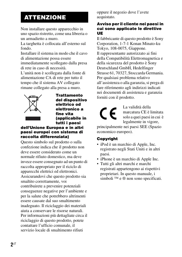 Il fabbricante di questo prodotto è Sony Corporation, 1-7-1 Konan Minato-ku Tokyo, 108-0075, Giappone. Il rappresentante autorizzato ai fini della Compatibilità Elettromagnetica e della sicurezza del prodotto è Sony Deutschland GmbH, Hedelfinger Strasse 61, 70327, Stoccarda Germania. Per qualsiassi problema relativo all'assistenza o alla garanzia, si prega di fare riferimento agli indirizzi significati nei documenti di assistenza e garanzia forniti con il prodotto.