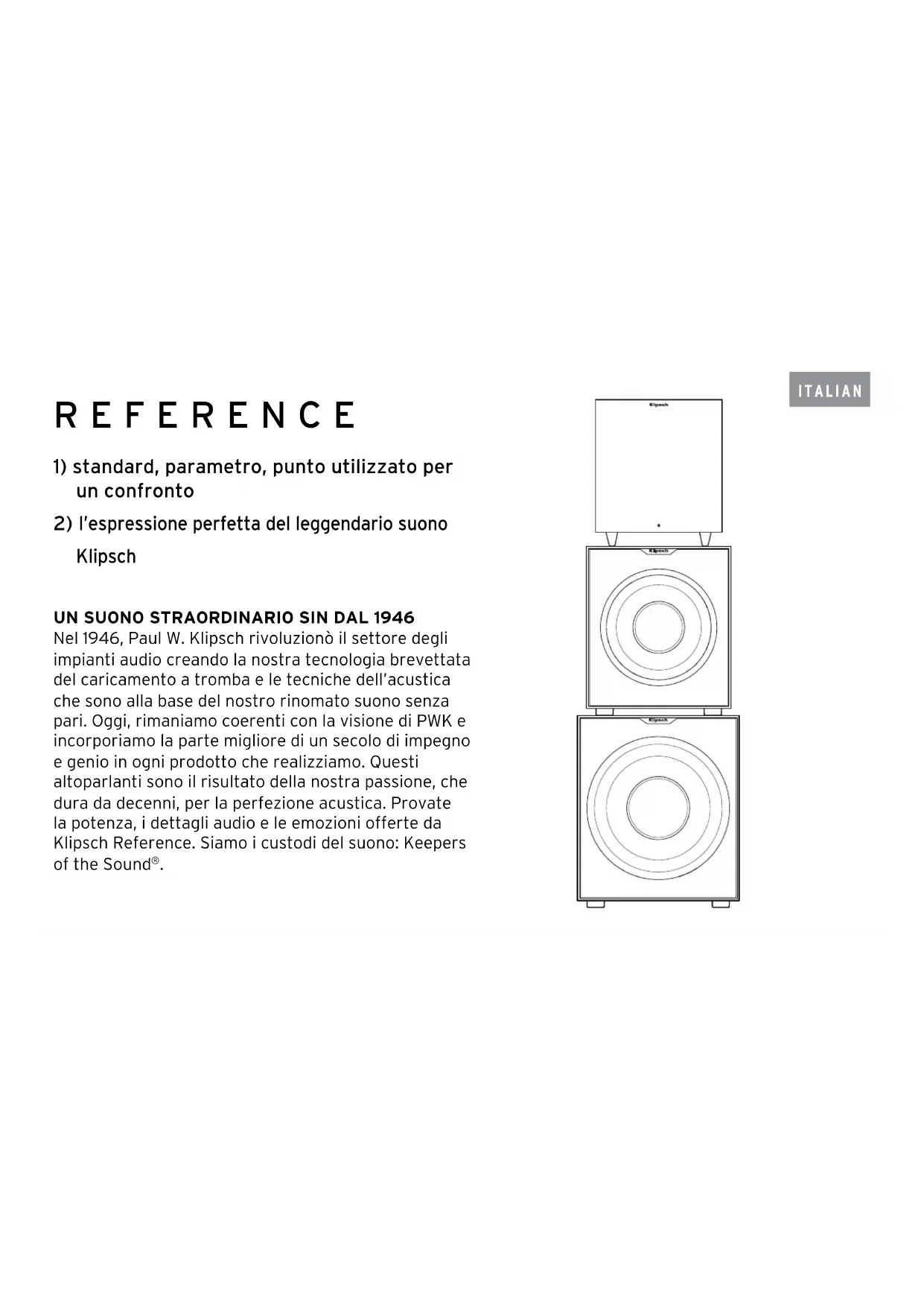 Nel 1946, Paul W. Klipsch rivoluzionò il settore degli impianti audio creando la nostra tecnologia brevettata del caricamento a tromba e le tecniche dell’acustica che sono alla base del nostro rinomato suono senza pari. Oggi, rimaniamo coerenti con la visione di PWK e incorporiamo la parte migliore di un secolo di impegno e genio in ogni prodotto che realizziamo. Questi altoparlanti sono il risultato della nostra passione, che dura da decenni, per la perfezione acustica. Provate la potenza, i dettagli audio e le emozioni offerte da Klipsch Reference. Siamo i custodi del suono: Keepers of the Sound