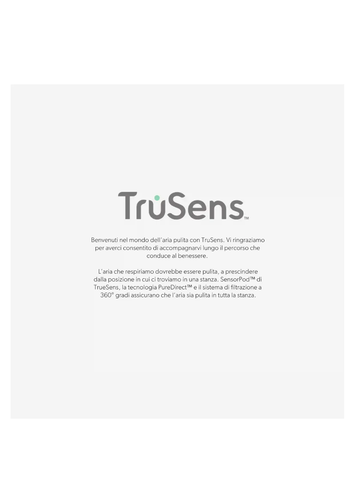 Fig. P87 GARANZIA Il funzionamento di questa macchina è garantito per due anni dalla data di acquisto, subordinatamente a uso normale. Durante il periodo di garanzia, ACCO provvederà, a propria discrezione, a riparare o sostituire gratuitamente la macchina difettosa. Difetti risultanti dall’uso improprio o dall’uso per scopi diversi da quelli per cui il prodotto è stato concepito non sono coperti dalla garanzia. Sarà necessario fornire una prova della data di acquisto. Riparazioni o modifiche effettuate da persone non autorizzate da ACCO invalideranno la garanzia. ACCO si propone di assicurare che i propri prodotti funzionino in conformità alle caratteristiche tecniche indicate. La presente garanzia non pregiudica alcun diritto riconosciuto ai consumatori dalla normativa nazionale vigente in materia di vendita di beni. SUPPORTO Grazie per aver acquistato il purificatore d’aria TruSens™. I nostri clienti sono al centro di tutte le nostre attività e siamo impegnati a realizzare prodotti adatti al loro stile di vita. In caso di domande o feedback, contattate il nostro team! Visitate il nostro sito web all’indirizzo www.leitz.com/trusens Inviateci un’e-mail all’indirizzo assistenzaitalia@acco.com Chiamateci al numero 800868616 Per registrare e attivare la garanzia, visitare www.leitz.com/registerBienvenido al aire limpio con TruSens. Gracias por permitirnos acompañarle en su viaje hacia el bienestar. El aire que respira debe estar limpio, independientemente de en qué parte de la sala se encuentre. TruSens SensorPod™, la tecnología PureDirect™ y la filtración de 360 grados garantizan poder disfrutar de un aire más limpio en toda la sala.89