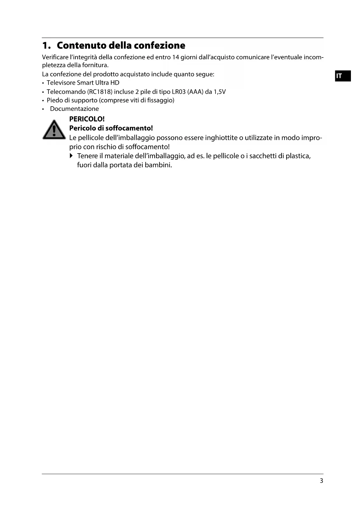 - Documentazione PERICOLO! Pericolo di soffocamento! Le pellicole dell’imballaggio possono essere inghiottite o utilizzate in modo impro- prio con rischio di soffocamento! Tenere il materiale dell’imballaggio, ad es. le pellicole o i sacchetti di plastica, fuori dalla portata dei bambini.4