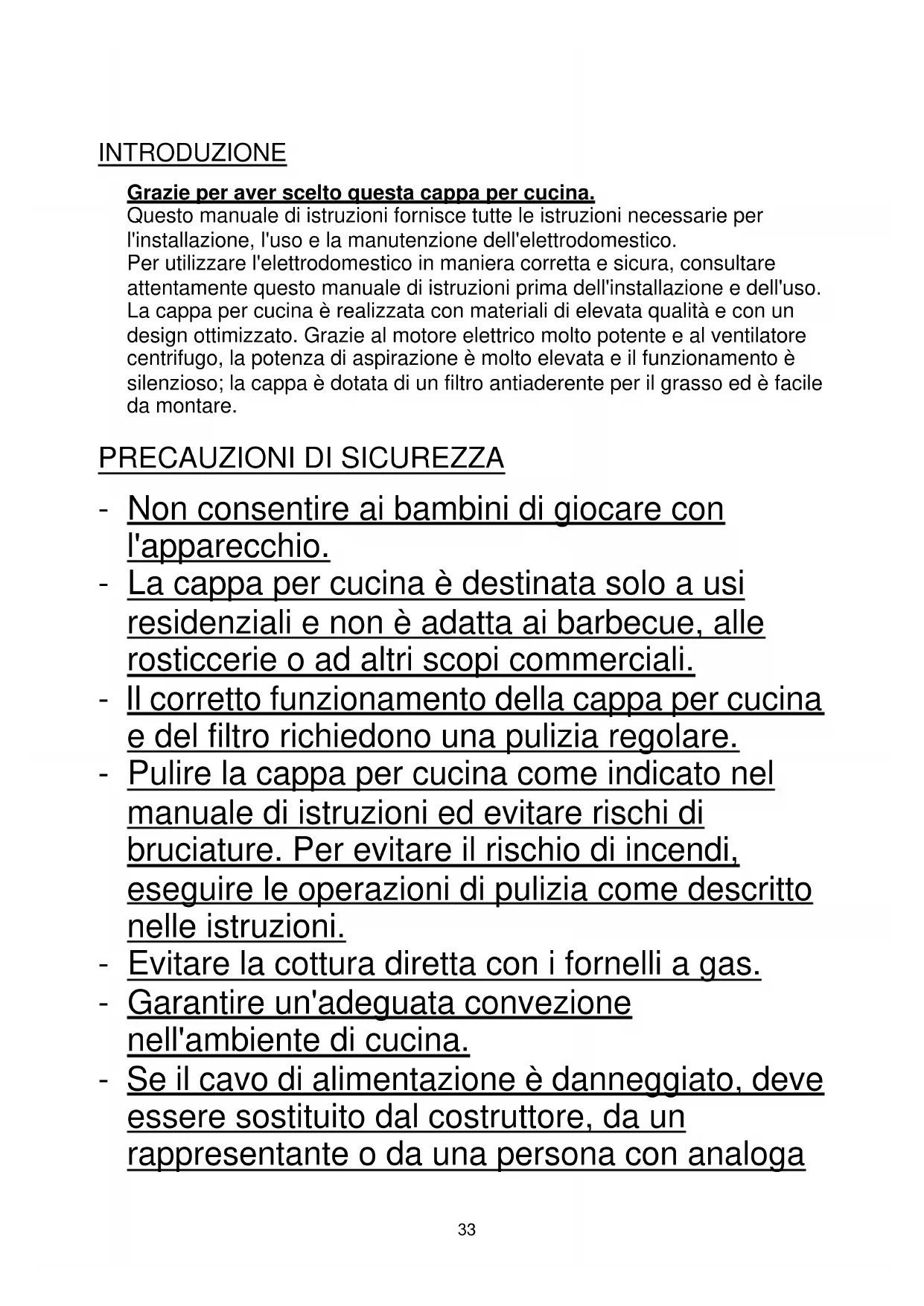 INTRODUZIONE Grazie per aver scelto questa cappa per cucina. Questo manuale di istruzioni fornisce tutte le istruzioni necessarie per l'installazione, l'uso e la manutenzione dell'elettrodomestico. Per utilizzare l'elettrodomestico in maniera corretta e sicura, consultare attentamente questo manuale di istruzioni prima dell'installazione e dell'uso. La cappa per cucina è realizzata con materiali di elevata qualità e con un design ottimizzato. Grazie al motore elettrico molto potente e al ventilatore centrifugo, la potenza di aspirazione è molto elevata e il funzionamento è silenzioso; la cappa è dotata di un filtro antiaderente per il grasso ed è facile da montare.