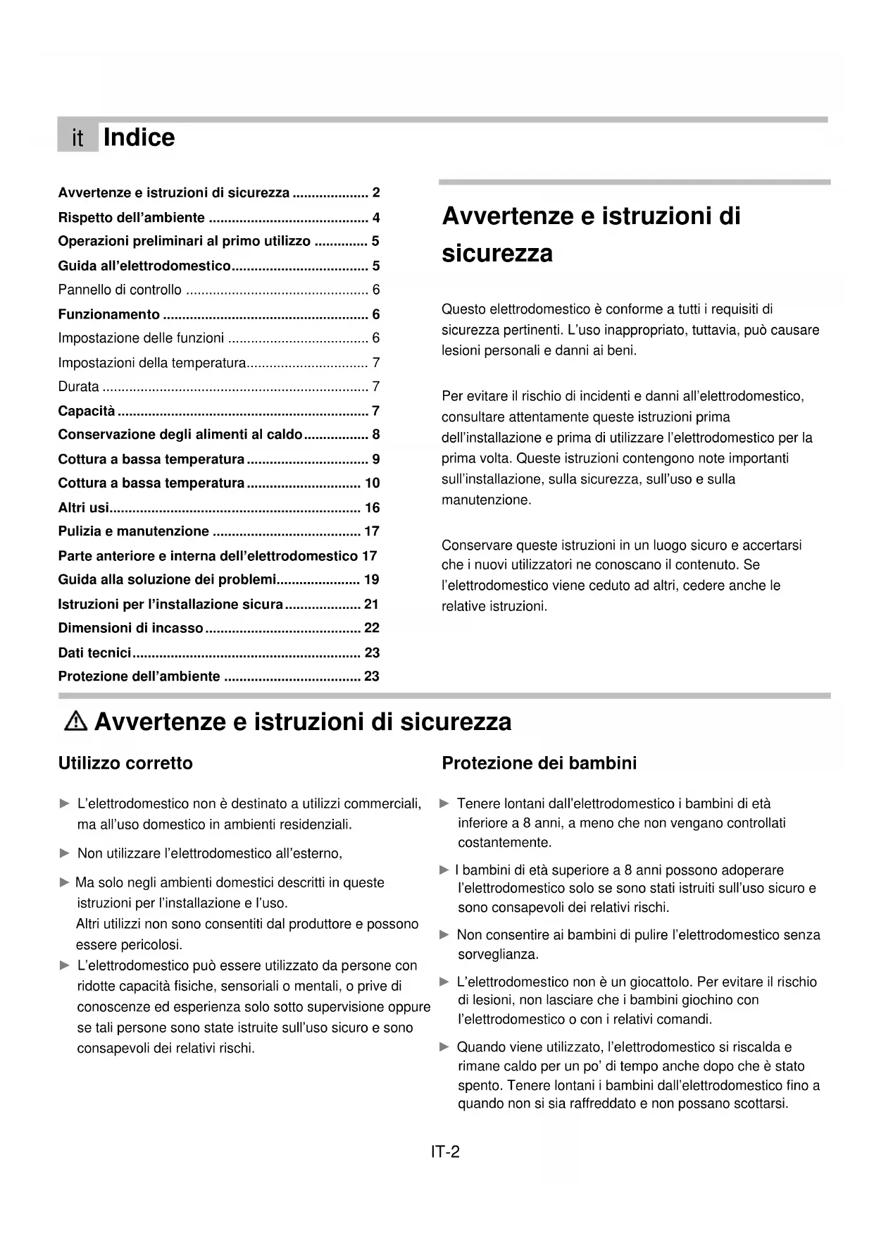 - Protezione dell’ambiente Avvertenze e istruzioni di sicurezza Questo elettrodomestico è conforme a tutti i requisiti di sicurezza pertinenti. L’uso inappropriato, tuttavia, può causare lesioni personali e danni ai beni. Per evitare il rischio di incidenti e danni all’elettrodomestico, consultare attentamente queste istruzioni prima dell’installazione e prima di utilizzare l’elettrodomestico per la prima volta. Queste istruzioni contengono note importanti sull’installazione, sulla sicurezza, sull’uso e sulla manutenzione. Conservare queste istruzioni in un luogo sicuro e accertarsi che i nuovi utilizzatori ne conoscano il contenuto. Se l’elettrodomestico viene ceduto ad altri, cedere anche le relative istruzioni. p. 23