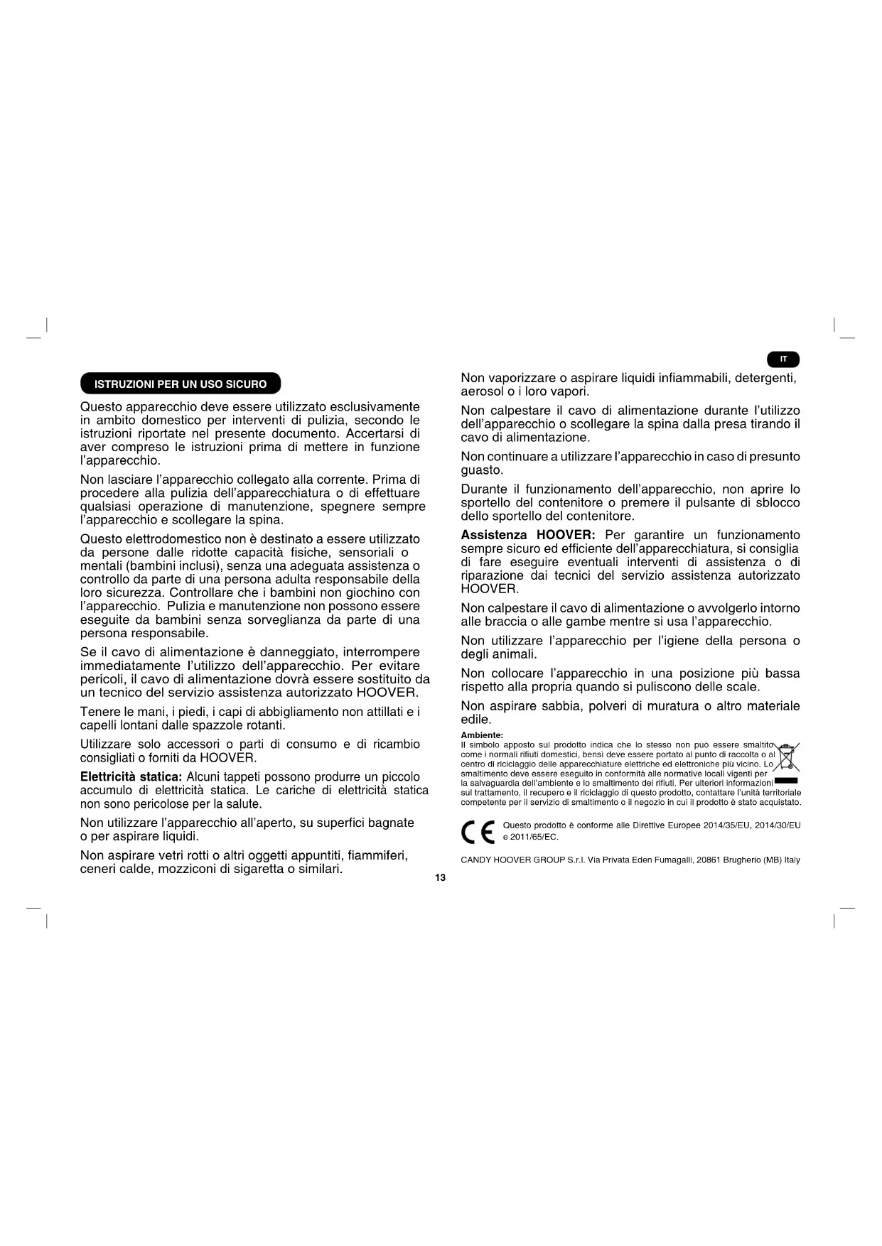 Questo apparecchio deve essere utilizzato esclusivamente in ambito domestico per interventi di pulizia, secondo le istruzioni riportate nel presente documento. Accertarsi di aver compreso le istruzioni prima di mettere in funzione l’apparecchio. Non lasciare l’apparecchio collegato alla corrente. Prima di procedere alla pulizia dell’apparecchiatura o di effettuare qualsiasi operazione di manutenzione, spegnere sempre l’apparecchio e scollegare la spina. Questo elettrodomestico non è destinato a essere utilizzato da persone dalle ridotte capacità siche, sensoriali o mentali (bambini inclusi), senza una adeguata assistenza o controllo da parte di una persona adulta responsabile della loro sicurezza. Controllare che i bambini non giochino con l’apparecchio. Pulizia e manutenzione non possono essere eseguite da bambini senza sorveglianza da parte di una persona responsabile. Se il cavo di alimentazione è danneggiato, interrompere immediatamente l’utilizzo dell’apparecchio. Per evitare pericoli, il cavo di alimentazione dovrà essere sostituito da un tecnico del servizio assistenza autorizzato HOOVER. Tenere le mani, i piedi, i capi di abbigliamento non attillati e i capelli lontani dalle spazzole rotanti. Utilizzare solo accessori o parti di consumo e di ricambio consigliati o forniti da HOOVER. Elettricità statica: Alcuni tappeti possono produrre un piccolo accumulo di elettricità statica. Le cariche di elettricità statica non sono pericolose per la salute. Non utilizzare l’apparecchio all’aperto, su superci bagnate o per aspirare liquidi. Non aspirare vetri rotti o altri oggetti appuntiti, ammiferi, ceneri calde, mozziconi di sigaretta o similari. Non vaporizzare o aspirare liquidi inammabili, detergenti, aerosol o i loro vapori. Non calpestare il cavo di alimentazione durante l’utilizzo dell’apparecchio o scollegare la spina dalla presa tirando il cavo di alimentazione. Non continuare a utilizzare l’apparecchio in caso di presunto guasto. Durante il funzionamento dell’apparecchio, non aprire lo sportello del contenitore o premere il pulsante di sblocco dello sportello del contenitore. Assistenza HOOVER: Per garantire un funzionamento sempre sicuro ed efciente dell’apparecchiatura, si consiglia di fare eseguire eventuali interventi di assistenza o di riparazione dai tecnici del servizio assistenza autorizzato HOOVER. Non calpestare il cavo di alimentazione o avvolgerlo intorno alle braccia o alle gambe mentre si usa l’apparecchio. Non utilizzare l’apparecchio per l’igiene della persona o degli animali. Non collocare l’apparecchio in una posizione più bassa rispetto alla propria quando si puliscono delle scale. Non aspirare sabbia, polveri di muratura o altro materiale edile. Ambiente: Il simbolo apposto sul prodotto indica che lo stesso non può essere smaltito come i normali riuti domestici, bensì deve essere portato al punto di raccolta o al centro di riciclaggio delle apparecchiature elettriche ed elettroniche più vicino. Lo smaltimento deve essere eseguito in conformità alle normative locali vigenti per la salvaguardia dell’ambiente e lo smaltimento dei riuti. Per ulteriori informazioni sul trattamento, il recupero e il riciclaggio di questo prodotto, contattare l’unità territoriale competente per il servizio di smaltimento o il negozio in cui il prodotto è stato acquistato. Questo prodotto è conforme alle Direttive Europee 2014/35/EU, 2014/30/EU e 2011/65/EC. CANDY HOOVER GROUP S.r.l. Via Privata Eden Fumagalli, 20861 Brugherio (MB) Italy IT14 A. Pulsante a pedale Accen- sione/Spegnimento B. Coperchio ltro pre-motore C. Maniglia contenitore D. Corpo interno del contenitore E. Pulsante di sblocco dello spor- tello del contenitore F. Indicatore meccanico contenitore pieno G. Pulsante di blocco dell’estremità del tubo essibile H. Tubo essibile