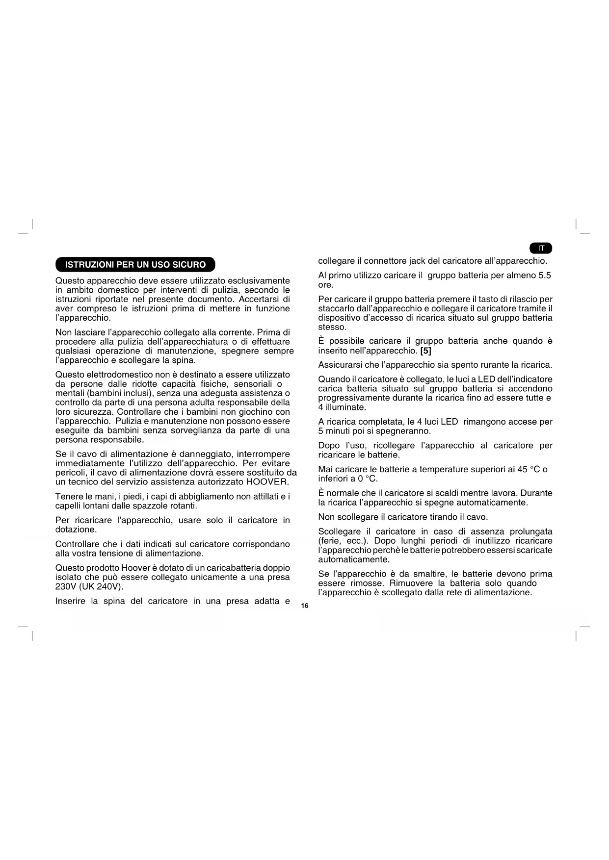 Questo apparecchio deve essere utilizzato esclusivamente in ambito domestico per interventi di pulizia, secondo le istruzioni riportate nel presente documento. Accertarsi di aver compreso le istruzioni prima di mettere in funzione l’apparecchio. Non lasciare l’apparecchio collegato alla corrente. Prima di procedere alla pulizia dell’apparecchiatura o di effettuare qualsiasi operazione di manutenzione, spegnere sempre l’apparecchio e scollegare la spina. Questo elettrodomestico non è destinato a essere utilizzato da persone dalle ridotte capacità siche, sensoriali o mentali (bambini inclusi), senza una adeguata assistenza o controllo da parte di una persona adulta responsabile della loro sicurezza. Controllare che i bambini non giochino con l’apparecchio. Pulizia e manutenzione non possono essere eseguite da bambini senza sorveglianza da parte di una persona responsabile. Se il cavo di alimentazione è danneggiato, interrompere immediatamente l’utilizzo dell’apparecchio. Per evitare pericoli, il cavo di alimentazione dovrà essere sostituito da un tecnico del servizio assistenza autorizzato HOOVER. Tenere le mani, i piedi, i capi di abbigliamento non attillati e i capelli lontani dalle spazzole rotanti. Per ricaricare l’apparecchio, usare solo il caricatore in dotazione. Controllare che i dati indicati sul caricatore corrispondano alla vostra tensione di alimentazione. Questo prodotto Hoover è dotato di un caricabatteria doppio isolato che può essere collegato unicamente a una presa 230V (UK 240V). Inserire la spina del caricatore in una presa adatta e collegare il connettore jack del caricatore all’apparecchio. Al primo utilizzo caricare il gruppo batteria per almeno 5.5 ore. Per caricare il gruppo batteria premere il tasto di rilascio per staccarlo dall’apparecchio e collegare il caricatore tramite il dispositivo d’accesso di ricarica situato sul gruppo batteria stesso. È possibile caricare il gruppo batteria anche quando è inserito nell’apparecchio. [5] Assicurarsi che l’apparecchio sia spento rurante la ricarica. Quando il caricatore è collegato, le luci a LED dell’indicatore carica batteria situato sul gruppo batteria si accendono progressivamente durante la ricarica no ad essere tutte e 4 illuminate. A ricarica completata, le 4 luci LED rimangono accese per 5 minuti poi si spegneranno. Dopo l’uso, ricollegare l’apparecchio al caricatore per ricaricare le batterie. Mai caricare le batterie a temperature superiori ai 45 °C o inferiori a 0 °C. È normale che il caricatore si scaldi mentre lavora. Durante la ricarica l’apparecchio si spegne automaticamente. Non scollegare il caricatore tirando il cavo. Scollegare il caricatore in caso di assenza prolungata (ferie, ecc.). Dopo lunghi periodi di inutilizzo ricaricare l’apparecchio perchè le batterie potrebbero essersi scaricate automaticamente. Se l’apparecchio è da smaltire, le batterie devono prima essere rimosse. Rimuovere la batteria solo quando l’apparecchio è scollegato dalla rete di alimentazione. IT17 Smaltire le batterie in sicurezza. Far funzionare l’apparecchio no al suo arresto ed assicurarsi che le batterie siano completamente scariche. Le batterie usate devono essere riposte in un centro di riciclaggio e non smaltite con i riuti domestici. Per rimuovere le batterie, si prega di contattare il Centro Servizi per Assistenza Clienti Hoover o procedere in base alle seguenti istruzioni. IMPORTANTE: Scaricare sempre completamente le batterie prima della rimozione ed assicurarsi che il caricatore sia scollegato. Procedere con la pulizia no a quando le batterie sono completamente scariche. Rimuovere il connettore jack per la ricarica dall’apparecchio. Premere il pulsante di rilascio per estrarre il gruppo batteria. [5] Estrarre lentamente la batteria dal suo alloggiamento. [5] NOTA: Se si riscontrano difcoltà a smantellare l’unità o per informazioni più dettagliate sul trattamento, recupero e riciclaggio di questo apparecchio, si prega di contattare l’ufcio comunale per il servizio smaltimento riuti. Non sostituire le batterie con batterie non ricaricabili Utilizzare solo accessori o parti di consumo e di ricambio consigliati o forniti da HOOVER. Elettricità statica: Alcuni tappeti possono produrre un piccolo accumulo di elettricità statica. Le cariche di elettricità statica non sono pericolose per la salute. Non utilizzare l’apparecchio all’aperto, su superci bagnate o per aspirare liquidi. Non aspirare oggetti solidi o appuntiti, ammiferi, ceneri calde, mozziconi di sigaretta o similari. Non vaporizzare o aspirare liquidi inammabili, detergenti, aerosol o i loro vapori. Non calpestare il cavo di alimentazione durante l’utilizzo dell’apparecchio o scollegare la spina dalla presa tirando il cavo di alimentazione. Non continuare a utilizzare l’apparecchio in caso di presunto guasto. Assistenza HOOVER: Per garantire un funzionamento sempre sicuro ed efciente dell’apparecchiatura, si consiglia di fare eseguire eventuali interventi di assistenza o di riparazione dai tecnici del servizio assistenza autorizzato HOOVER. Non calpestare il cavo di alimentazione o avvolgerlo intorno alle braccia o alle gambe mentre si usa l’apparecchio. Non utilizzare l’apparecchio per l’igiene della persona o degli animali. Non collocare l’apparecchio in una posizione più bassa rispetto alla propria quando si puliscono delle scale. Ambiente: Il simbolo apposto sul prodotto indica che lo stesso non può essere smaltito come i normali riuti domestici, bensì deve essere portato al punto di raccolta o al centro di riciclaggio delle apparecchiature elettriche ed elettroniche più vicino. Lo smaltimento deve essere eseguito in conformità alle normative locali vigenti per la salvaguardia dell’ambiente e lo smaltimento dei riuti. Per ulteriori informazioni sul trattamento, il recupero e il riciclaggio di questo prodotto, contattare l’unità territoriale competente per il serv