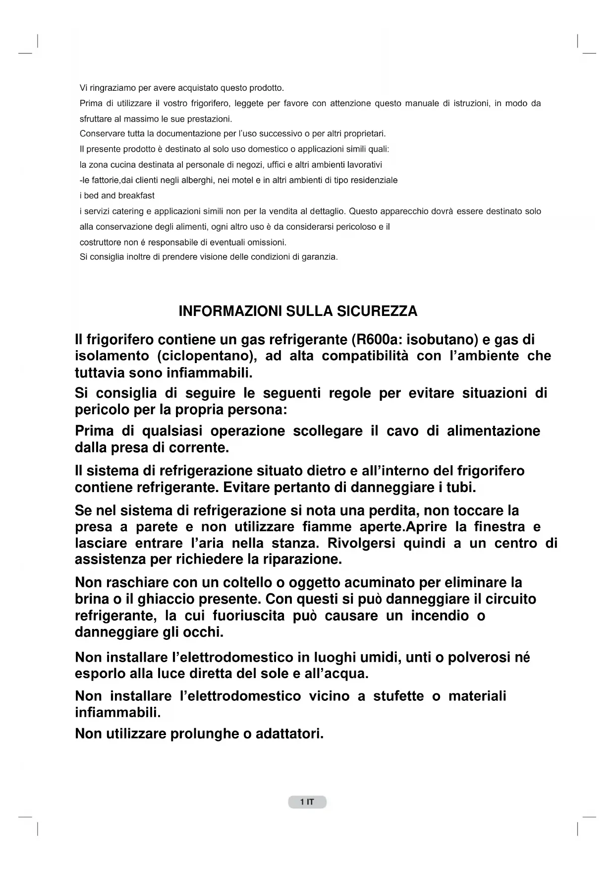 Il frigorifero contiene un gas refrigerante (R600a: isobutano) e gas di isolamento (ciclopentano), ad alta compatibilità con l’ambiente che tuttavia sono infiammabili. Si consiglia di seguire le seguenti regole per evitare situazioni di pericolo per la propria persona: Prima di qualsiasi operazione scollegare il cavo di alimentazione dalla presa di corrente. Il sistema di refrigerazione situato dietro e all’interno del frigorifero contiene refrigerante. Evitare pertanto di danneggiare i tubi. Se nel sistema di refrigerazione si nota una perdita, non toccare la presa a parete e non utilizzare fiamme aperte.Aprire la finestra e lasciare entrare l’aria nella stanza. Rivolgersi quindi a un centro di assistenza per richiedere la riparazione. Non raschiare con un coltello o oggetto acuminato per eliminare la brina o il ghiaccio presente. Con questi si può danneggiare il circuito refrigerante, la cui fuoriuscita può causare un incendio o danneggiare gli occhi. Non installare l’elettrodomestico in luoghi umidi, unti o polverosi né esporlo alla luce diretta del sole e all’acqua. Non installare l’elettrodomestico vicino a stufette o materiali infiammabili. Non utilizzare prolunghe o adattatori. 1 ITNon danneggiare la spina e/o il cavo di alimentazione, questo potrebbe causare scosse elettriche o incendi. Si consiglia di tenere pulita la spina, eventuali residui eccessivi di polvere sulla spina possono essere causa di incendio. Non utilizzare dispositivi meccanici o altri apparecchi per accelerare il processo di sbrinamento. Evitare assolutamente l’uso di fiamma aperta o di apparecchi elettrici, come apparecchi di riscaldamento, pulitrici a vapore, candele, lampade a petrolio e simili per accelerare la fase di sbrinamento. Non utilizzare o conservare spray infiammabili, come vernici spray vicino al frigorifero. Potrebbero causare esplosioni o incendi. Non usare apparecchi elettrici all’interno degli scomparti per la conservazione dei cibi, se questi non sono del tipo raccomandato dal costruttore. Non riporre o conservare materiali infiammabili e altamente volatili come etere, benzina, GPL, gas propano, bombolette spray, collanti, alcool puro, ecc. Questi materiali potrebbero provocare esplosioni. Quando il materiale che necessita di un controllo rigido delle temperature di conservazione viene conservato, è possibile che si deteriori o si può verificare una reazione incontrollata che può provocare rischi. Mantenere libere da ostruzioni le aperture di ventilazione nell’involucro dell’apparecchio o nella struttura ad incasso. Non collocare oggetti e/o recipienti pieni d’acqua sopra l’elettrodomestico, Non tirare né piegare eccessivamente il cavo di alimentazione o toccare la spina con le mani bagnate. Evitate di effettuare interventi su questo frigorifero. Ogni intervento deve essere eseguito solo da personale tecnico specializzato. Questo elettrodomestico non dovrà essere destinato a persone (compresi bambini) con handicap fisici, sensoriali, mentali, o mancanti di esperienza o conoscenza d’ uso, senza la supervisione di persone che abbiano preso visione delle istruzioni d’uso e che siano direttamente responsabili della loro sicurezza. Accertarsi che i bambini non giochino vicino all’elettrodomestico per preservare la loro sicurezza.