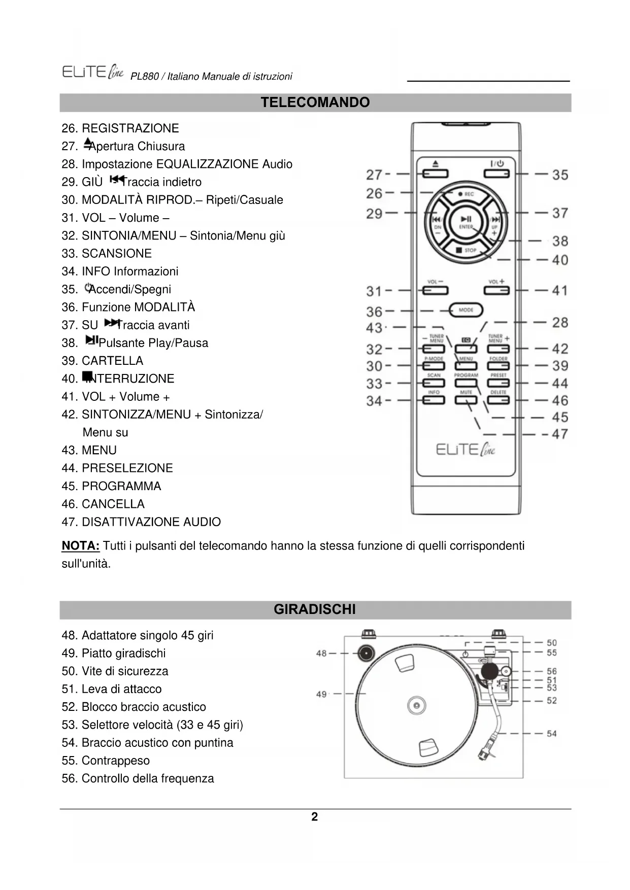 NOTA: Tutti i pulsanti del telecomando hanno la stessa funzione di quelli corrispondenti sull'unità. GIRADISCHI