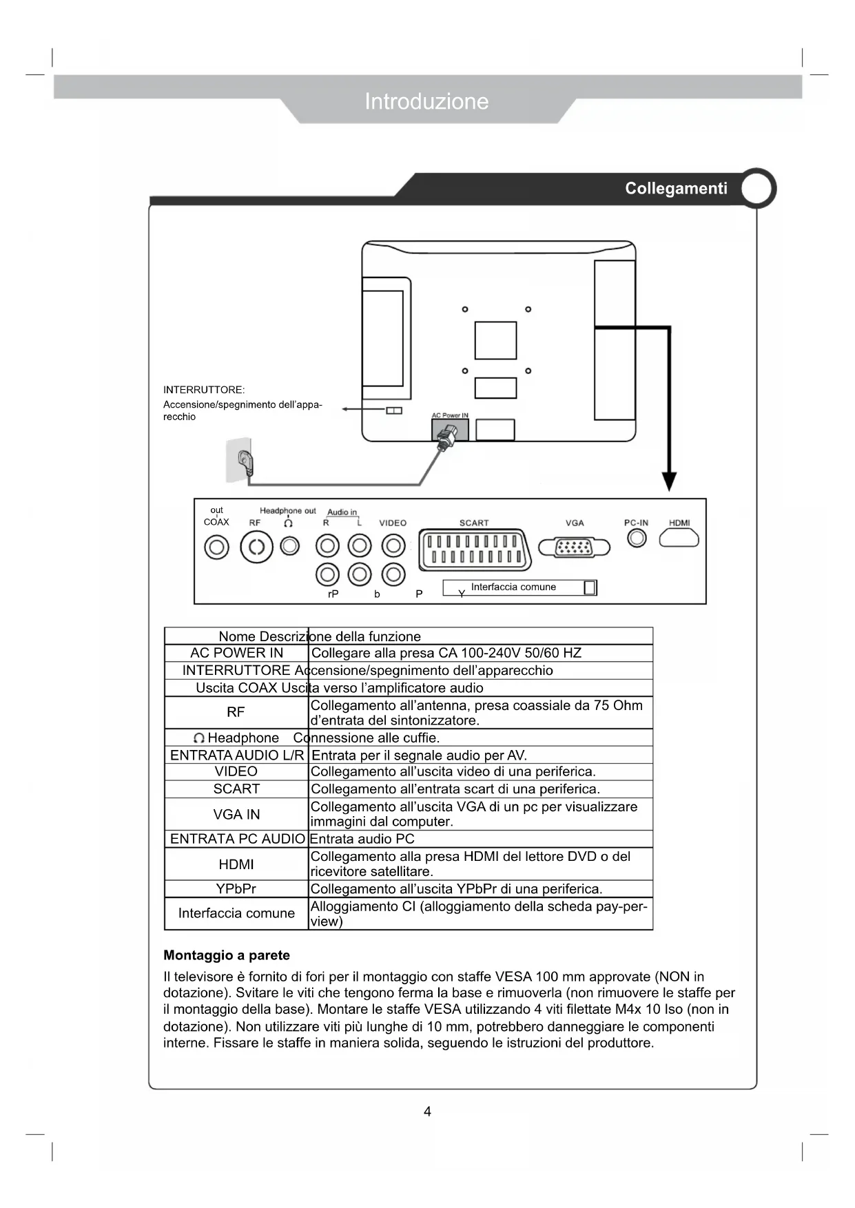 ENTRATA AUDIO L/R Entrata per il segnale audio per AV. VIDEO Collegamento all’uscita video di una periferica. SCART Collegamento all’entrata scart di una periferica. VGA IN Collegamento all’uscita VGA di un pc per visualizzare immagini dal computer. ENTRATA PC AUDIO Entrata audio PC HDMI Collegamento alla presa HDMI del lettore DVD o del ricevitore satellitare. YPbPr Collegamento all’uscita YPbPr di una periferica. Interfaccia comune