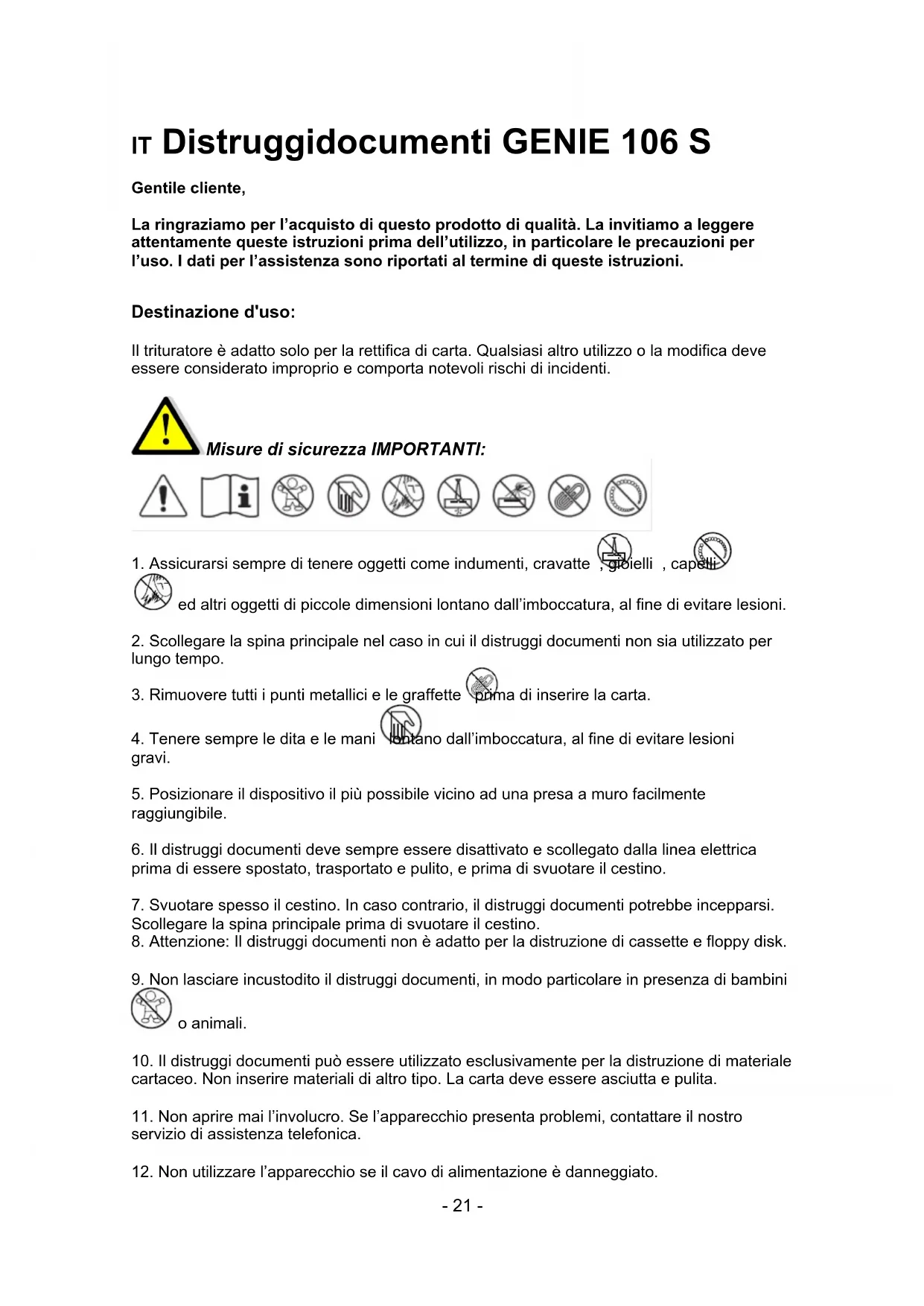 Las directivas: Declaramos que este dispositivo ha sido fabricado conforme a las normas y reglamentos aplicables. Importador: GENIE GmbH & Co. KG Berta-Cramer-Ring 22 65205 Wiesbaden, Germany- 21 - IT Distruggidocumenti GENIE 106 S Gentile cliente, La ringraziamo per l’acquisto di questo prodotto di qualità. La invitiamo a leggere attentamente queste istruzioni prima dell’utilizzo, in particolare le precauzioni per l’uso. I dati per l’assistenza sono riportati al termine di queste istruzioni.