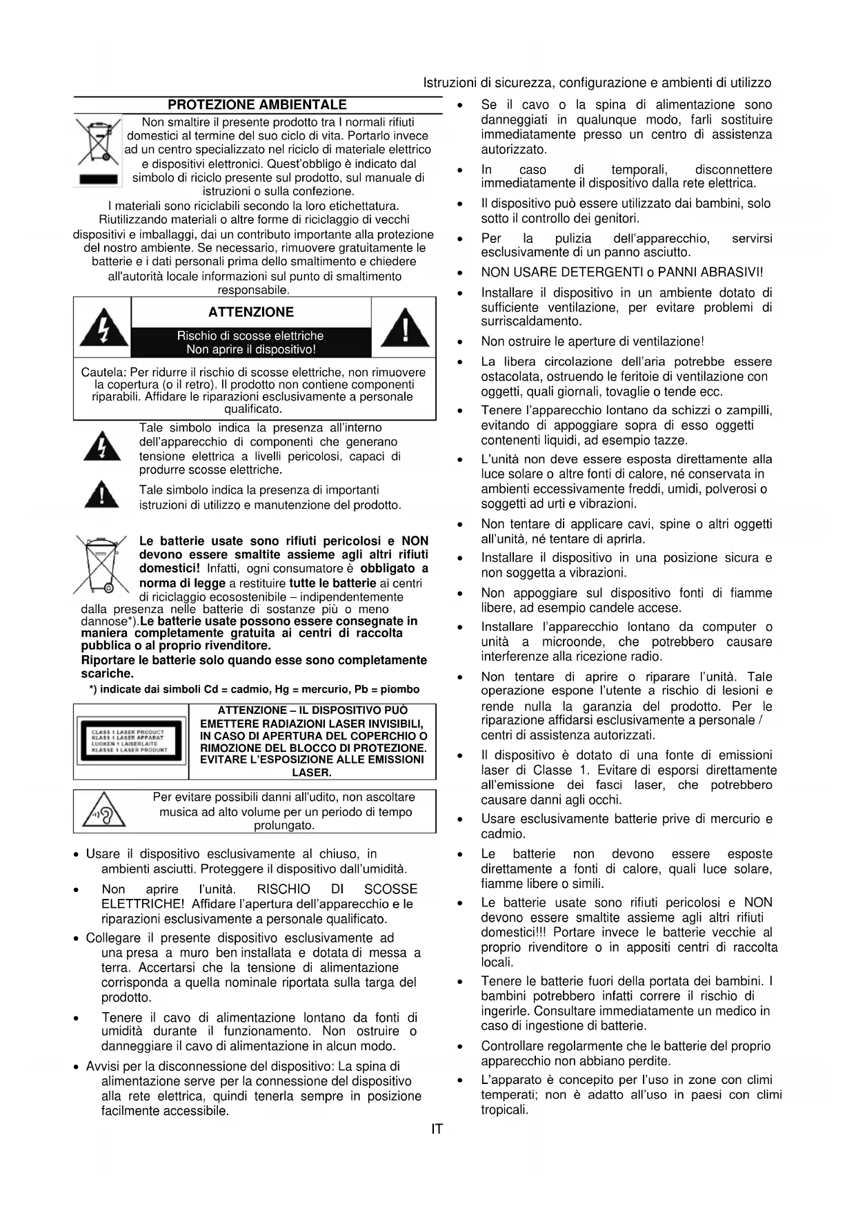dalla presenza nelle batterie di sostanze più o meno dannose*).Le batterie usate possono essere consegnate in maniera completamente gratuita ai centri di raccolta pubblica o al proprio rivenditore. Riportare le batterie solo quando esse sono completamente scariche. *) indicate dai simboli Cd = cadmio, Hg = mercurio, Pb = piombo