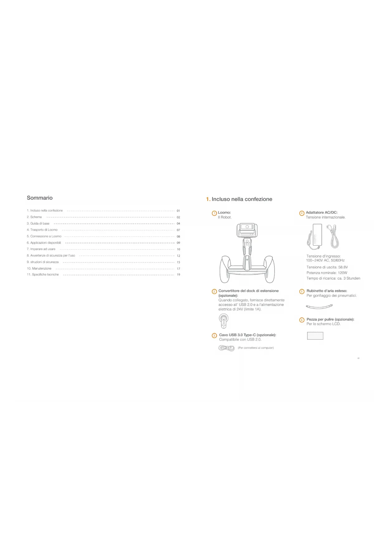 Loomo: Il Robot. Rubinetto d'aria esteso: Per gonfiaggio dei pneumatici. Cavo USB 3.0 Type-C (opzionale): Compatibile con USB 2.0. (Per connettersi al computer) Adattatore AC/DC: Tensione internazionale. Tensione d'ingresso: Tensione di uscita: 58.8V Potenza nominale: 120W Tempo di ricarica: ca. 3 Stunden Pezza per pulire (opzionale): Per lo schermo LCD. Convertitore del dock di estensione (opzionale): Quando collegato, fornisce direttamente accesso all’ USB 2.0 e a l’alimentazione elettrica di 24V (limite 1A). 100~240V AC, 50/60Hz