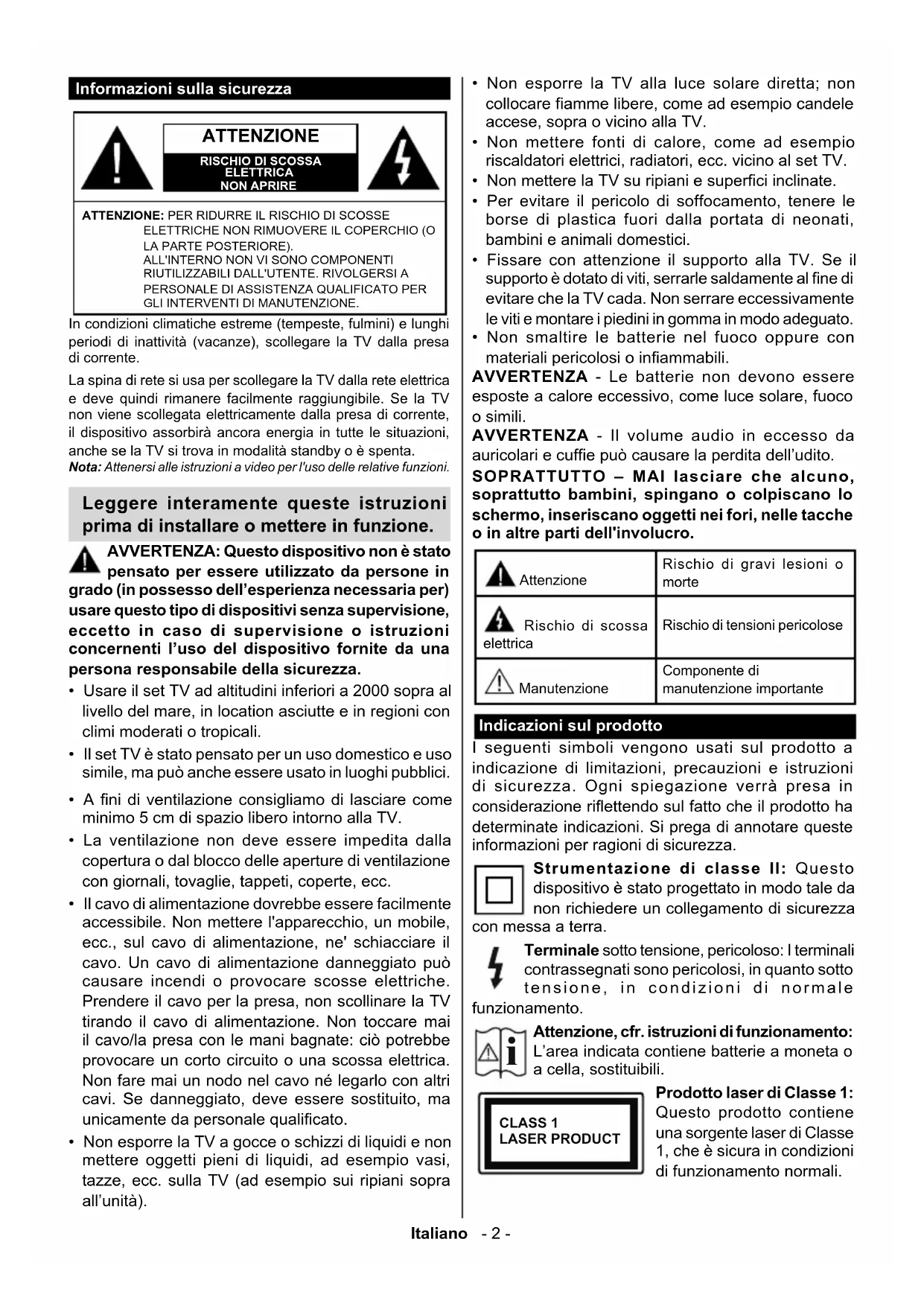 Attenzione, cfr. istruzioni di funzionamento: L’area indicata contiene batterie a moneta o a cella, sostituibili. CLASS 1 LASER PRODUCT Prodotto laser di Classe 1: Questo prodotto contiene una sorgente laser di Classe 1, che è sicura in condizioni di funzionamento normali.Italiano - 3 - AVVERTENZA Non ingerire batterie, pericolo di esplosione chimica. Il prodotto o gli accessori forniti in dotazione col prodotto potrebbero contenere una batteria a moneta/bottone. Se la batteria a cella, modello moneta/bottone viene ingoiata, può causare gravi lesioni interne in sole 2 ore e può portare al decesso. Tenere lontano dalla portata dei bambini batterie nuove e batterie usate. Se lo scomparto batterie non si chiude in modo sicuro, smettere di usare il prodotto e tenerlo lontano dalla portata dei bambini. Qualora si ritenga che le batterie vengano ingoiate o collocate all'interno del corpo, rivolgersi immediatamente a un medico. – – – – – – – – – – – – Non collocare mai il set TV in una posizione instabile o inclinata. La TV potrebbe cadere, causando gravi lesioni personali o morte. Molte lesioni, in particolare ai bambini, possono essere evitate prendendo facili precauzioni, quali ad esempio: