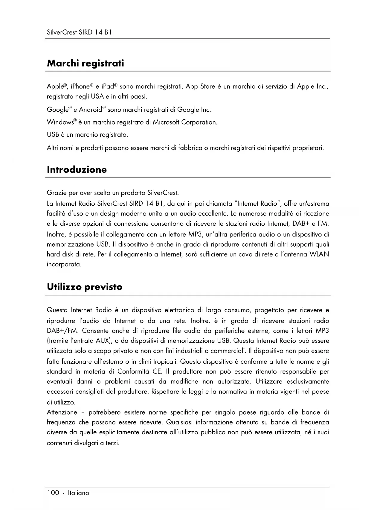 è un marchio registrato di Microsoft Corporation. USB è un marchio registrato. Altri nomi e prodotti possono essere marchi di fabbrica o marchi registrati dei rispettivi proprietari. Introduzione Grazie per aver scelto un prodotto SilverCrest. La Internet Radio SilverCrest SIRD 14 B1, da qui in poi chiamata “Internet Radio”, offre un'estrema facilità d’uso e un design moderno unito a un audio eccellente. Le numerose modalità di ricezione e le diverse opzioni di connessione consentono di ricevere le stazioni radio Internet, DAB+ e FM. Inoltre, è possibile il collegamento con un lettore MP3, un’altra periferica audio o un dispositivo di memorizzazione USB. Il dispositivo è anche in grado di riprodurre contenuti di altri supporti quali hard disk di rete. Per il collegamento a Internet, sarà sufficiente un cavo di rete o l’antenna WLAN incorporata. Utilizzo previsto Questa Internet Radio è un dispositivo elettronico di largo consumo, progettato per ricevere e riprodurre l’audio da Internet o da una rete. Inoltre, è in grado di ricevere stazioni radio DAB+/FM. Consente anche di riprodurre file audio da periferiche esterne, come i lettori MP3 (tramite l’entrata AUX), o da dispositivi di memorizzazione USB. Questa Internet Radio può essere utilizzata solo a scopo privato e non con fini industriali o commerciali. Il dispositivo non può essere fatto funzionare all’esterno o in climi tropicali. Questo dispositivo è conforme a tutte le norme e gli standard in materia di Conformità CE. Il produttore non può essere ritenuto responsabile per eventuali danni o problemi causati da modifiche non autorizzate. Utilizzare esclusivamente accessori consigliati dal produttore. Rispettare le leggi e la normativa in materia vigenti nel paese di utilizzo. Attenzione – potrebbero esistere norme specifiche per singolo paese riguardo alle bande di frequenza che possono essere ricevute. Qualsiasi informazione ottenuta su bande di frequenza diverse da quelle esplicitamente destinate all’utilizzo pubblico non può essere utilizzata, né i suoi contenuti divulgati a terzi.SilverCrest SIRD 14 B1 Italiano - 101 Contenuto della confezione