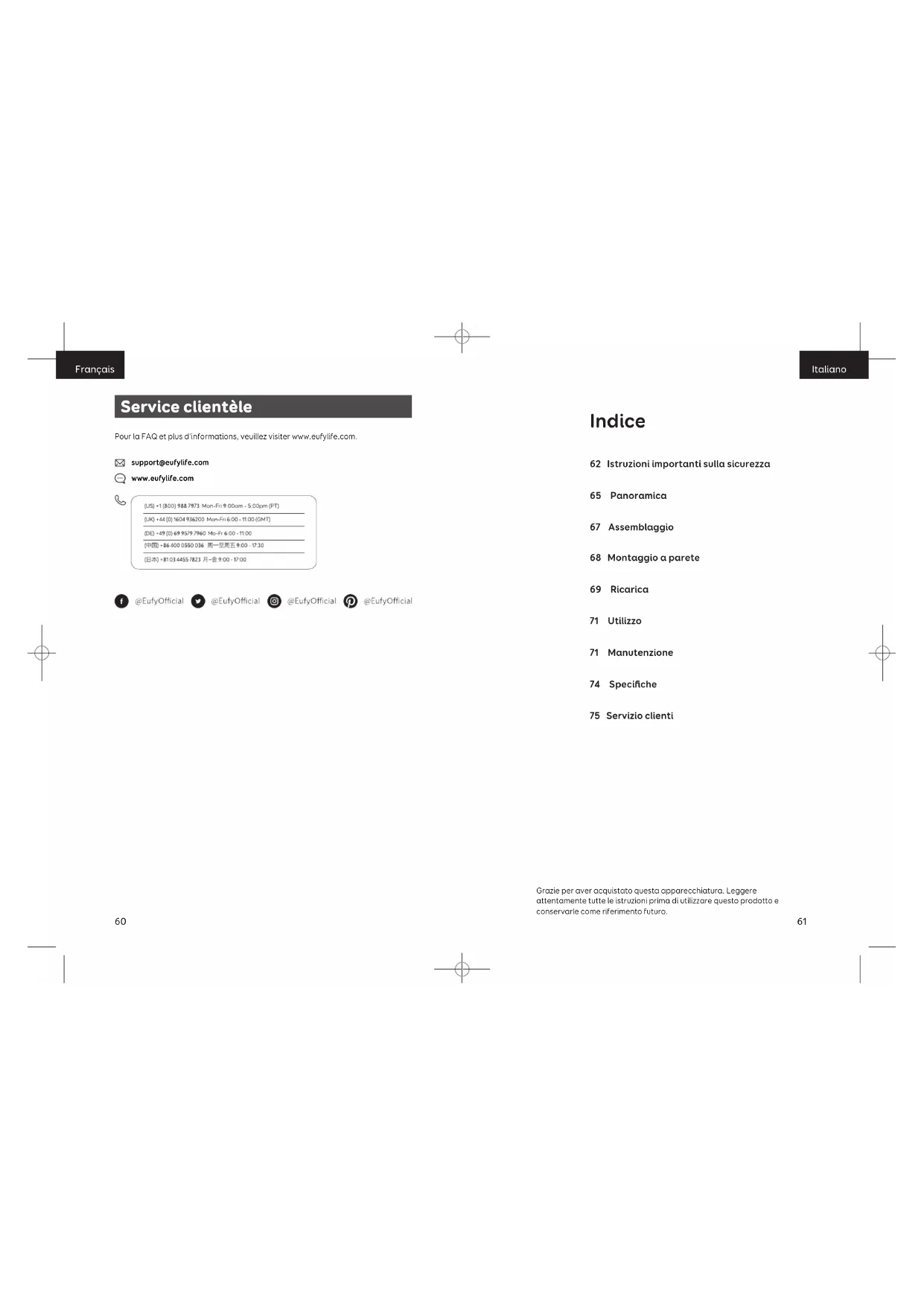 support@eufylife.com www.eufylife.com Grazie per aver acquistato questa apparecchiatura. Leggere attentamente tutte le istruzioni prima di utilizzare questo prodotto e conservarle come riferimento futuro. Indice 62 Istruzioni importanti sulla sicurezza 65 Panoramica 67 Assemblaggio 68 Montaggio a parete 69 Ricarica 71 Utilizzo 71 Manutenzione 74 Specifiche 75 Servizio clientiItaliano Italiano