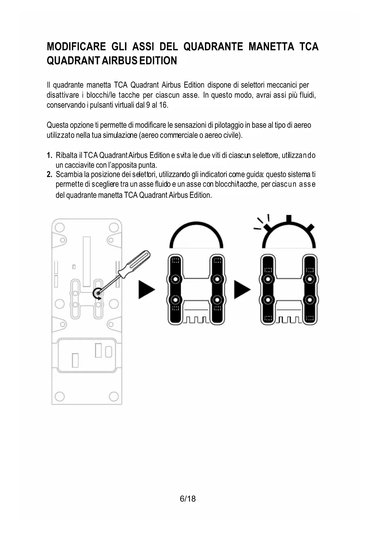 permette di scegliere tra un asse fluido e un asse con blocchi/tacche, per ciascun asse del quadrante manetta TCA Quadrant Airbus Edition.7/18 DISABILITARE GLI INVERSORI DI SPINTA DEL QUADRANTE