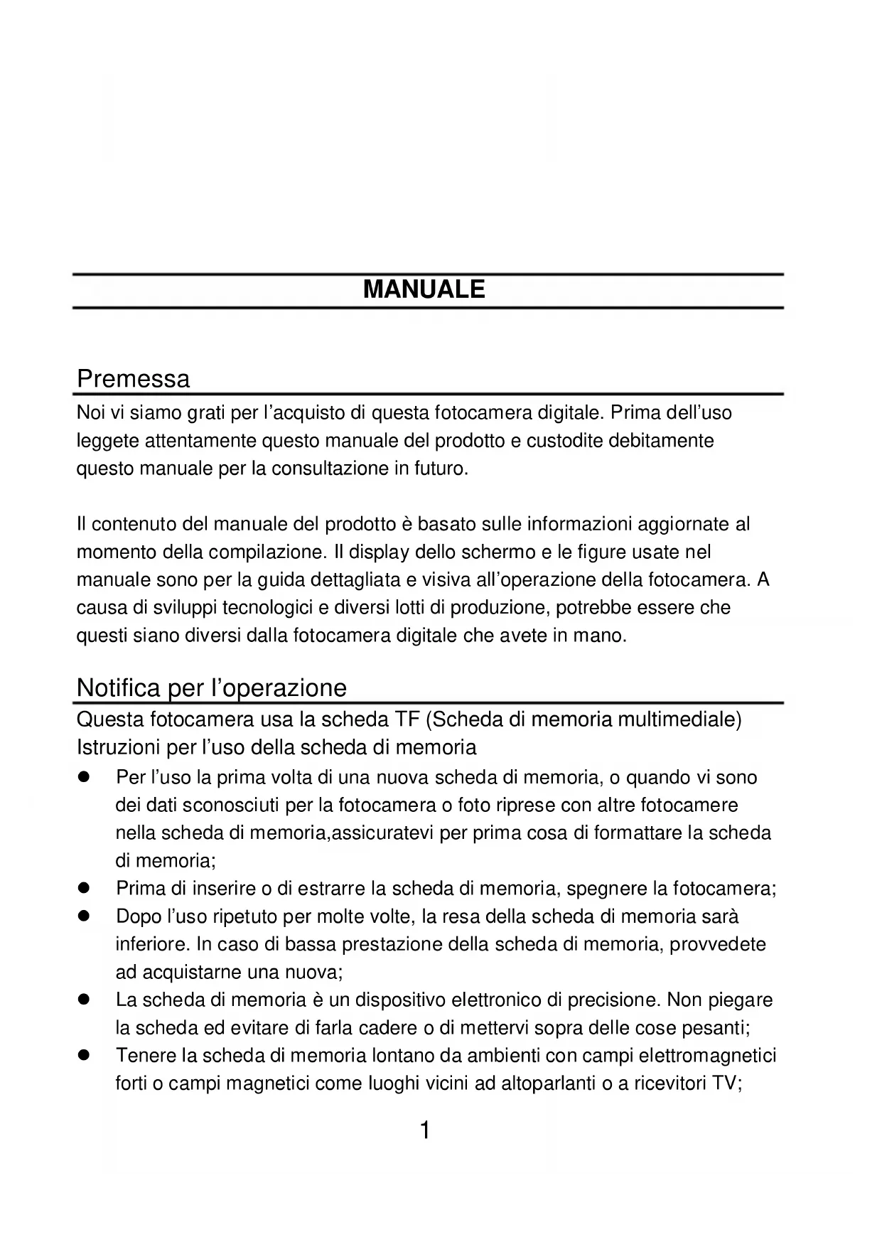 Premessa Noi vi siamo grati per l’acquisto di questa fotocamera digitale. Prima dell’uso leggete attentamente questo manuale del prodotto e custodite debitamente questo manuale per la consultazione in futuro. Il contenuto del manuale del prodotto è basato sulle informazioni aggiornate al momento della compilazione. Il display dello schermo e le figure usate nel manuale sono per la guida dettagliata e visiva all’operazione della fotocamera. A causa di sviluppi tecnologici e diversi lotti di produzione, potrebbe essere che questi siano diversi dalla fotocamera digitale che avete in mano. Notifica per l’operazione Questa fotocamera usa la scheda TF (Scheda di memoria multimediale) Istruzioni per l’uso della scheda di memoria Per l’uso la prima volta di una nuova scheda di memoria, o quando vi sono dei dati sconosciuti per la fotocamera o foto riprese con altre fotocamere nella scheda di memoria,assicuratevi per prima cosa di formattare la scheda di memoria; Prima di inserire o di estrarre la scheda di memoria, spegnere la fotocamera; Dopo l’uso ripetuto per molte volte, la resa della scheda di memoria sarà inferiore. In caso di bassa prestazione della scheda di memoria, provvedete ad acquistarne una nuova; La scheda di memoria è un dispositivo elettronico di precisione. Non piegare la scheda ed evitare di farla cadere o di mettervi sopra delle cose pesanti; Tenere la scheda di memoria lontano da ambienti con campi elettromagnetici forti o campi magnetici come luoghi vicini ad altoparlanti o a ricevitori TV;2 Tenere la scheda di memoria lontano da ambienti con temperatura eccessivamente alta o bassa; Tenere pulita la scheda di memoria ed evitare che venga a contatto di liquidi. In caso di contatto con dei liquidi, pulirla ed asciugarla con un pezzo di panno morbido; In caso di inattività, tenere la scheda di memoria in una graffetta di protezione; Notare che con l’uso prolungato la scheda di memoria diventa molto calda, e questo è normale; Non usare una scheda di memoria che è stata usata su altri videoregistratori digitali o fotocamere digitali. In caso di uso di una tale scheda di memoria, prima procedere a formattarla; È’ proibito l’uso della scheda di memoria formattata con altri videoregistratori digitali o fotocamere digitali; Se capita alla scheda di memoria una delle cose seguenti, i dati registrati potrebbero venirne danneggiati: - Uso scorretto della scheda di memoria; - Spegnere o estrarre la scheda di memoria durante la registrazione, l’eliminazione (formattatura) o la lettura; Si consiglia di fare il backup dei dati importanti su altri media come disco morbido, disco fisso o CD; Per garantire la qualità dell’immagine, è necessaria per la scheda TF una scheda come minimo di alta velocità di classe 4. Manutenzione della fotocamera Usare un coperchio di protezione adatto per evitare che la lente o il display vengano graffiati; Prima della pulizia soffiare via la polvere e la sabbia dalla superficie della lente, e poi pulire delicatamente la lente con un panno o una carta adatti per la pulizia dei dispositivi ottici. Se necessario, usare il detergente per le lenti. È assolutamente proibito di pulire la fotocamera con una soluzione organica; È assolutamente proibito di toccare la superficie della lente con le dita.3 Requisiti del Sistema Quando operate e usate questa fotocamera digitale, fate attenzione ai requisiti minimi del sistema per la fotocamera. Vi consigliamo caldamente di usare un computer migliore per controllare la fotocamera per un effetto migliore. I requisiti minimi per il sistema sono i seguenti: Requisiti del Sistema Sistema operativo Microsoft Windows 7, 2000, XP, VISTA CPU Intel PIII667 o superiore o CPU con prestazione equivalente Memoria interna 512 MB o superiore Scheda audio, scheda grafica Scheda audio e scheda grafica supporta DirectX8 o superiore CD-ROM Velocità 4X o superiore Disco fisso Spazio libero minimo 1 GB Altro Una interfaccia standard USB 1.1 o USB 2.0