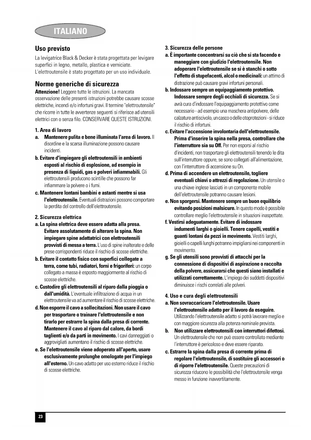 Poids kg 1,26 1,26 1,2623 ITALIANO Italiano Uso previsto La levigatrice Black & Decker è stata progettata per levigare superfici in legno, metallo, plastica e verniciate. L'elettroutensile è stato progettato per un uso individuale. Norme generiche di sicurezza Attenzione! Leggere tutte le istruzioni. La mancata osservazione delle presenti istruzioni potrebbe causare scosse elettriche, incendi e/o infortuni gravi. Il termine "elettroutensile" che ricorre in tutte le avvertenze seguenti si riferisce ad utensili elettrici con o senza filo. CONSERVARE QUESTE ISTRUZIONI.
