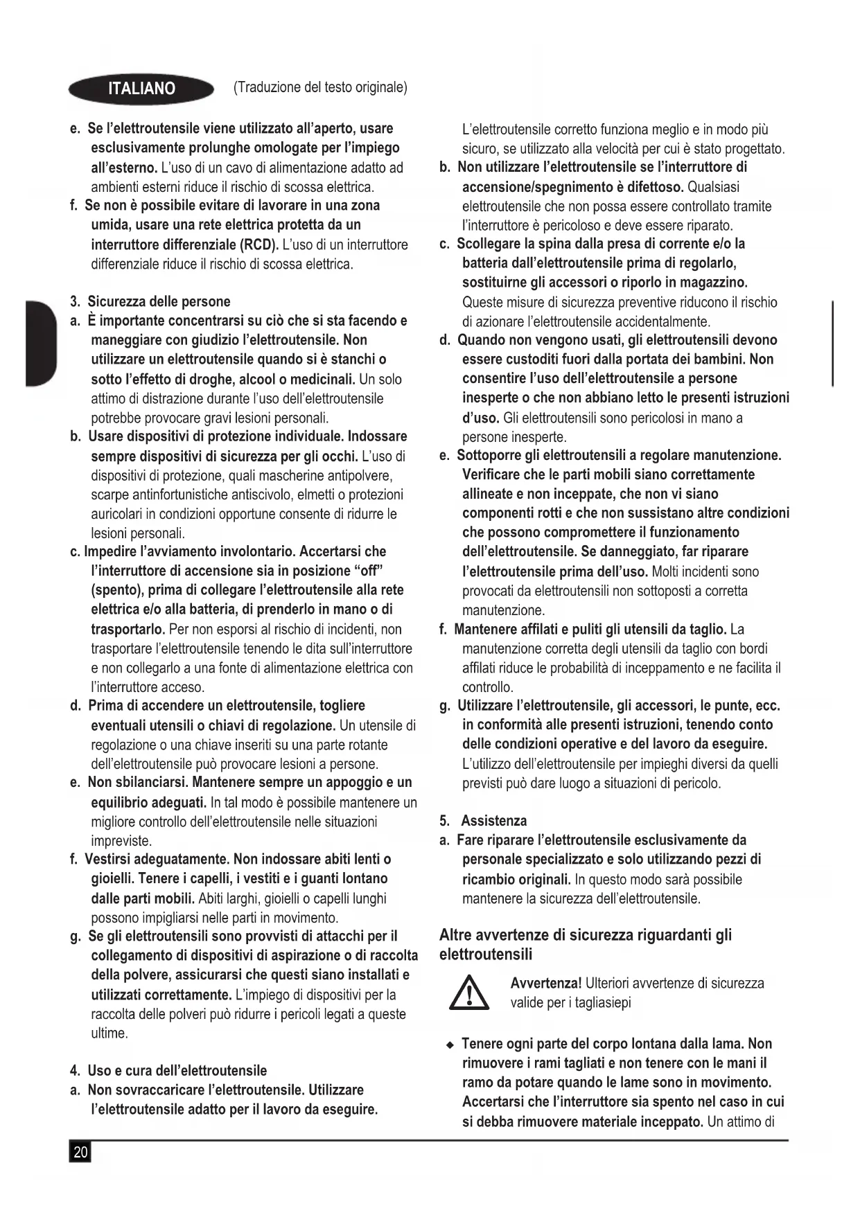 BEHT201 e BEHT251 sono stati progettati per il potare siepi, arbusti e rovi. Questi utensili sono destinati esclusivamente all’uso privato. Istruzioni di sicurezza Avvertenze di sicurezza generali per gli elettrouten- sili Avvertenza! Leggere attentamente tutte le avvertenze e le istruzioni di sicurezza. La mancata osservanza delle avvertenze e istruzi- oni elencate di seguito potrebbe dar luogo a scosse elettriche, incendi e/o infortuni gravi. Conservare tutte le avvertenze e le istruzioni per consul- tazioni successive. Il termine “elettroutensile” che ricorre in tutte le avvertenze seguenti si riferisce a utensili elettrici alimentati dalla rete (con lo) o a batteria (senza lo).