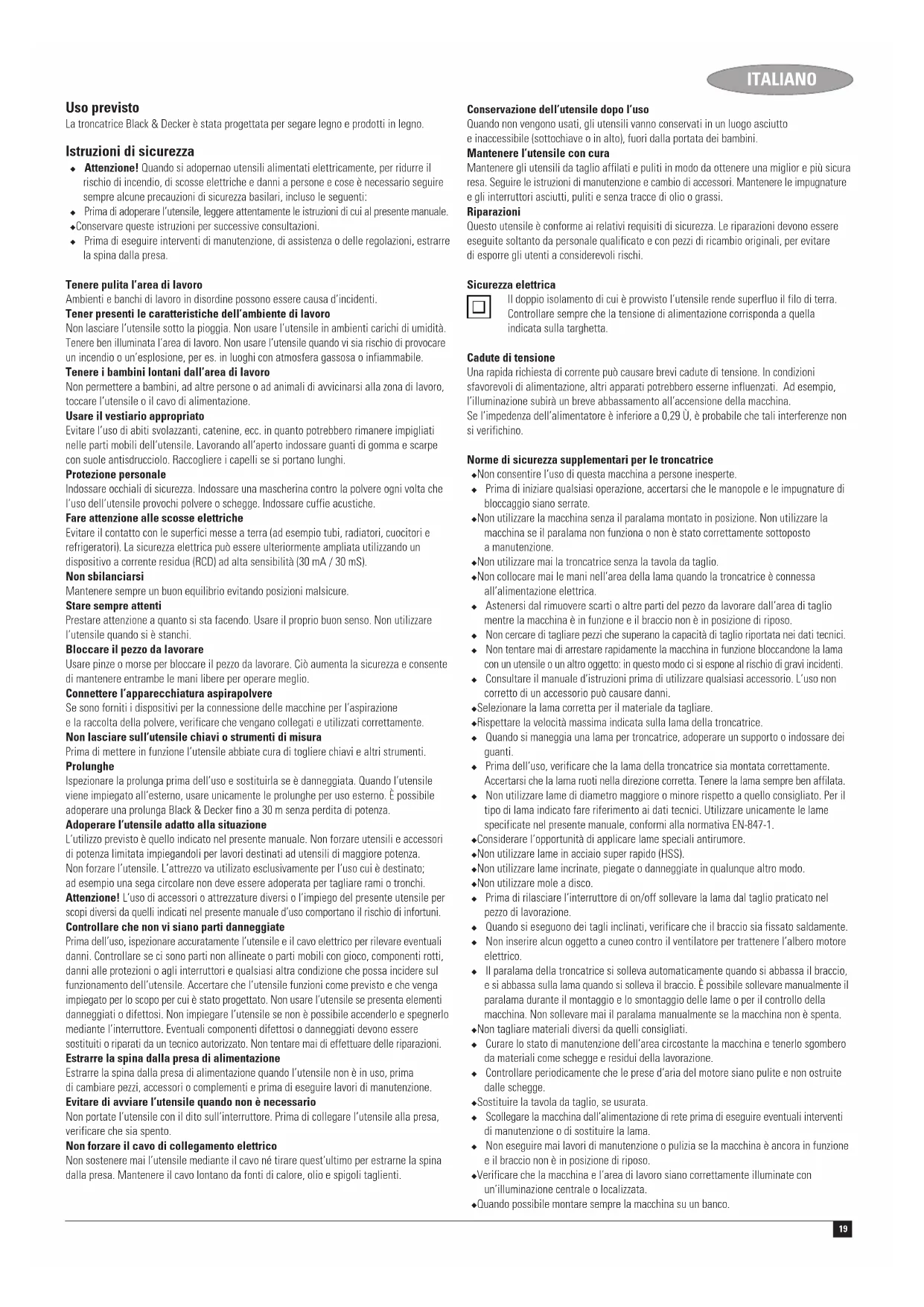 (incertitude de la puissance acoustique) 3 dB(A) Kevin Hewitt Directeur Ingénierie Client Spennymoor, County Durham DL16 6JG, Royaume Uni 1-7-2005 Garantie Black & Decker est confiant dans la qualité de ses produits et vous offre une garantie très étendue. Ce certificat de garantie est un document supplémentaire et ne peut en aucun cas se substituer à vos droits légaux. La garantie est valable sur l’ensemble des territoires des États Membres de l’Union Européenne et de la Zone de Libre Echange Européenne. Si un produit Black & Decker XT (sauf les accessoires, annexes, batteries, chargeurs et embouts) est défectueux en raison d’un défaut matériel, de main d’fiuvre ou de conformité dans les 3 ans suivant son acquisition, Black & Decker garantie le remplacement des pièces défaillantes, répare tout produit sujet à une usure ou des dégâts normaux voire remplace le dit produit, dans la mesure où il est enregistré sur le site Internet de garantie Black & Decker XT dans les 90 jours suivant l’acquisition. Si le produit n’est pas enregistré, alors seule la garantie standard (2 ans) s’applique. La garantie ne s’applique pas si : ◆ Le produit a été utilisé dans un but commercial, professionnel ou a été loué. ◆ Le produit a été mal utilisé ou avec négligence. ◆ Le produit a subi des dommages à cause d’objets étrangers, de substances ou à cause d’accidents. ◆ Une personne non qualifiée a tenté de réparer la machine, ◆ Le produit a subi une modification en regard de ses spécifications d’origine. ◆ Des accessoires ou annexes inappropriés ont été utilisés. La garantie étendue ne s’applique pas si : ◆ Une preuve d’achat et le certificat de garantie étendue d’origine n’ont pas été produits. Enregistrez dès à présent votre produit en ligne à www.blackanddecker.fr/xt afin de pouvoir bénéficier de la garantie étendu (3 ans) et recevoir des informations sur les nouveaux produits et les offres spéciales. Pour avoir recours à la garantie, il est nécessaire de fournir une preuve d’achat au vendeur ou à un réparateur agréé. Pour connaître l’adresse du réparateur agréé le plus proche de chez vous, contactez le bureau Black & Decker à l’adresse indiquée dans ce manuel. Vous pourrez aussi trouver une liste des réparateurs agréés de Black & Decker et de plus amples détails sur notre service après-vente sur le site Internet à l’adresse suivante : www.2helpU.com Pour plus d’informations concernant la marque Black & Decker et notre gamme de produits, consultez notre site www.blackanddecker.fr19 ITALIANO Uso previsto La troncatrice Black & Decker è stata progettata per segare legno e prodotti in legno. Istruzioni di sicurezza ◆ Attenzione! Quando si adopernao utensili alimentati elettricamente, per ridurre il rischio di incendio, di scosse elettriche e danni a persone e cose è necessario seguire sempre alcune precauzioni di sicurezza basilari, incluso le seguenti: ◆ Prima di adoperare l’utensile, leggere attentamente le istruzioni di cui al presente manuale. ◆ Conservare queste istruzioni per successive consultazioni. ◆ Prima di eseguire interventi di manutenzione, di assistenza o delle regolazioni, estrarre la spina dalla presa. Tenere pulita l’area di lavoro Ambienti e banchi di lavoro in disordine possono essere causa d’incidenti. Tener presenti le caratteristiche dell’ambiente di lavoro Non lasciare l’utensile sotto la pioggia. Non usare l’utensile in ambienti carichi di umidità. Tenere ben illuminata l’area di lavoro. Non usare l’utensile quando vi sia rischio di provocare un incendio o un’esplosione, per es. in luoghi con atmosfera gassosa o infiammabile. Tenere i bambini lontani dall’area di lavoro Non permettere a bambini, ad altre persone o ad animali di avvicinarsi alla zona di lavoro, toccare l’utensile o il cavo di alimentazione. Usare il vestiario appropriato Evitare l’uso di abiti svolazzanti, catenine, ecc. in quanto potrebbero rimanere impigliati nelle parti mobili dell’utensile. Lavorando all’aperto indossare guanti di gomma e scarpe con suole antisdrucciolo. Raccogliere i capelli se si portano lunghi. Protezione personale Indossare occhiali di sicurezza. Indossare una mascherina contro la polvere ogni volta che l’uso dell’utensile provochi polvere o schegge. Indossare cuffie acustiche. Fare attenzione alle scosse elettriche Evitare il contatto con le superfici messe a terra (ad esempio tubi, radiatori, cuocitori e refrigeratori). La sicurezza elettrica può essere ulteriormente ampliata utilizzando un dispositivo a corrente residua (RCD) ad alta sensibilità (30 mA / 30 mS). Non sbilanciarsi Mantenere sempre un buon equilibrio evitando posizioni malsicure. Stare sempre attenti Prestare attenzione a quanto si sta facendo. Usare il proprio buon senso. Non utilizzare l’utensile quando si è stanchi. Bloccare il pezzo da lavorare Usare pinze o morse per bloccare il pezzo da lavorare. Ciò aumenta la sicurezza e consente di mantenere entrambe le mani libere per operare meglio. Connettere l’apparecchiatura aspirapolvere Se sono forniti i dispositivi per la connessione delle macchine per l’aspirazione e la raccolta della polvere, verificare che vengano collegati e utilizzati correttamente. Non lasciare sull’utensile chiavi o strumenti di misura Prima di mettere in funzione l’utensile abbiate cura di togliere chiavi e altri strumenti. Prolunghe Ispezionare la prolunga prima dell’uso e sostituirla se è danneggiata. Quando l’utensile viene impiegato all’esterno, usare unicamente le prolunghe per uso esterno. È possibile adoperare una prolunga Black & Decker fino a 30 m senza perdita di potenza. Adoperare l’utensile adatto alla situazione L’utilizzo previsto è quello indicato nel presente manuale. Non forzare utensili e accessori di potenza limitata impiegandoli per lavori destinati ad utensili di maggiore potenza. Non forz