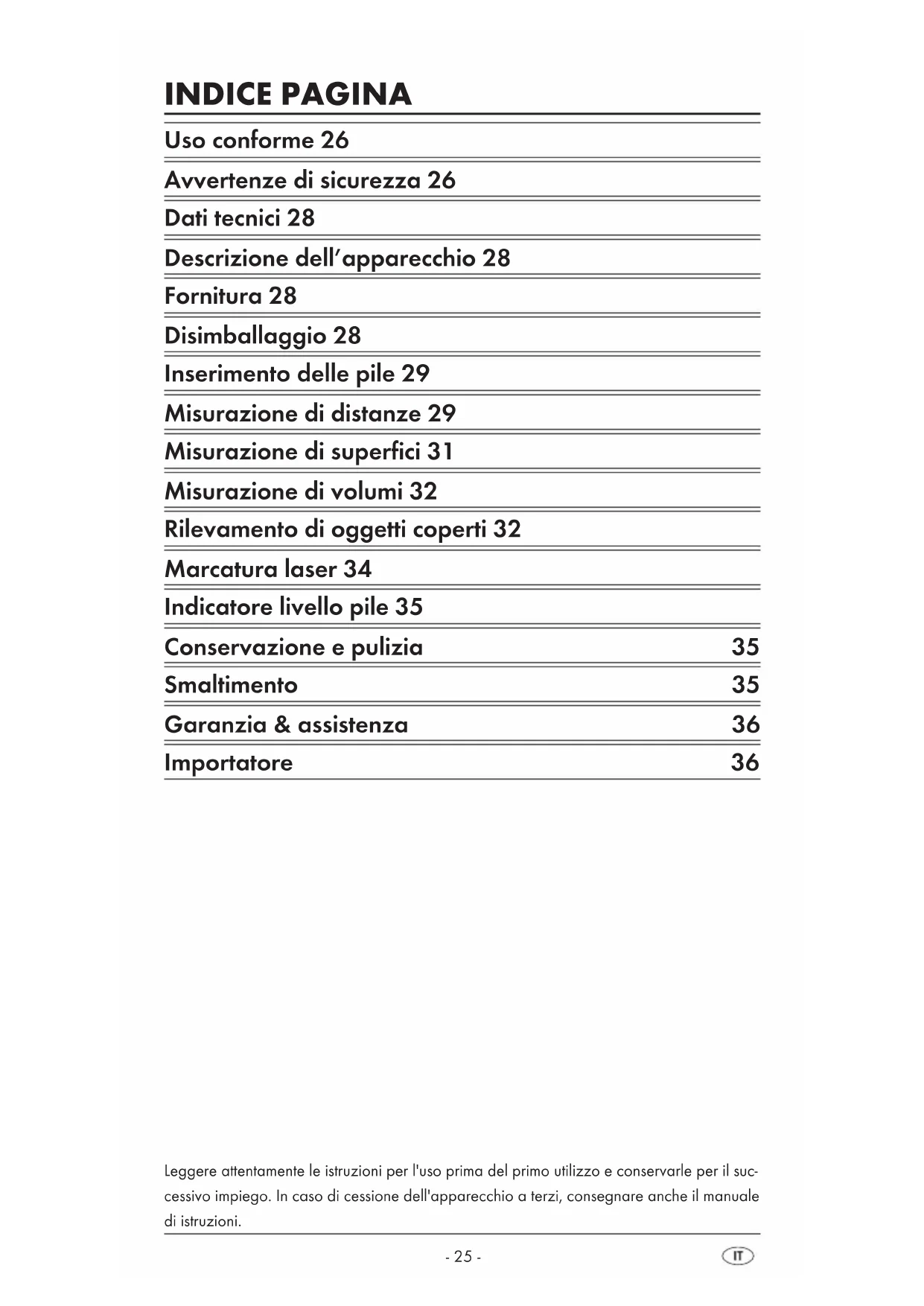 BURGSTRASSE 21 44867 BOCHUM, GERMANY www.kompernass.com IAN 107555 IAN 107555- 25 - INDICE PAGINA Uso conforme 26 Avvertenze di sicurezza 26 Dati tecnici 28 Descrizione dell’apparecchio 28 Fornitura 28 Disimballaggio 28 Inserimento delle pile 29 Misurazione di distanze 29 Misurazione di superfici 31 Misurazione di volumi 32 Rilevamento di oggetti coperti 32 Marcatura laser 34 Indicatore livello pile 35 Conservazione e pulizia 35 Smaltimento 35 Garanzia & assistenza 36 Importatore 36 Leggere attentamente le istruzioni per l'uso prima del primo utilizzo e conservarle per il suc- cessivo impiego. In caso di cessione dell'apparecchio a terzi, consegnare anche il manuale di istruzioni.- 26 - RILEVATORE MUTIFUNZIONE PMDL 5 A1 Uso conforme Il multirilevatore di misurazione laser è stato progettato per la rilevazione di linee elettriche, oggetti in metallo e legno, per la proiezione di linee laser, per il calcolo di superfici e volumi e per la misurazione di distanze. Questo apparecchio è desti- nato solo per l’uso privato. Non utilizzare a fini commerciali. Un uso diverso o esu- lante da quanto sopra è considerato non conforme e può causare danni e lesioni. Non si assume alcuna responsabilità per i danni derivanti dalla manipolazione del dispositivo laser e dell'emittente / ricevente a ultrasuoni e in caso di mancata osservanza delle avvertenze di sicurezza. Avvertenze di sicurezza Il lavoro ottimale e sicuro con il multirilevatore è possibile solo leggendo integral- mente il manuale di istruzioni e le avvertenze di sicurezza, e seguendo esatta- mente le indicazioni in esso contenute. Pericolo di lesioni!