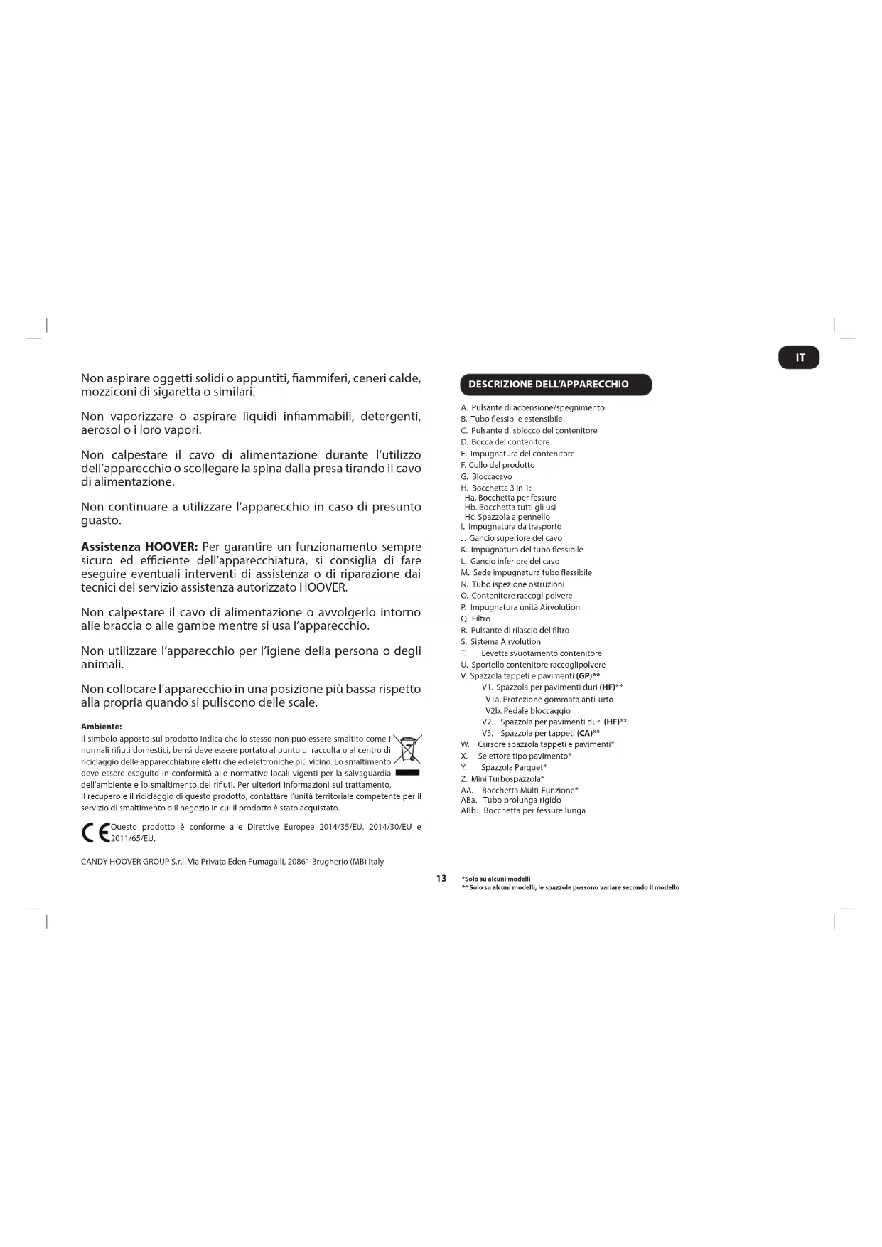 Questo apparecchio deve essere utilizzato esclusivamente in ambito domestico per interventi di pulizia, secondo le istruzioni riportate nel presente documento. Accertarsi di aver compreso le istruzioni prima di mettere in funzione l’apparecchio. Non lasciare l’apparecchio collegato alla corrente. Prima di procedere alla pulizia dell’apparecchiatura o di eettuare qualsiasi operazione di manutenzione, spegnere sempre l’apparecchio e scollegare la spina. Questo elettrodomestico non è destinato a essere utilizzato da persone dalle ridotte capacità siche, sensoriali o mentali (bambini inclusi), senza una adeguata assistenza o controllo da parte di una persona adulta responsabile della loro sicurezza. Controllare che i bambini non giochino con l’apparecchio. Pulizia e manutenzione non possono essere eseguite da bambini senza sorveglianza da parte di una persona responsabile. Se il cavo di alimentazione è danneggiato, interrompere immediatamente l’utilizzo dell’apparecchio. Per evitare pericoli, il cavo di alimentazione dovrà essere sostituito da un tecnico del servizio assistenza autorizzato HOOVER. Tenere le mani, i piedi, i capi di abbigliamento non attillati e i capelli lontani dalle spazzole rotanti. Utilizzare solo accessori o parti di consumo e di ricambio consigliati o forniti da HOOVER. Elettricità statica: Alcuni tappeti possono produrre un piccolo accumulo di elettricità statica. Le cariche di elettricità statica non sono pericolose per la salute. Non utilizzare l’apparecchio all’aperto, su superci bagnate o per aspirare liquidi.13 Non aspirare oggetti solidi o appuntiti, ammiferi, ceneri calde, mozziconi di sigaretta o similari. Non vaporizzare o aspirare liquidi inammabili, detergenti, aerosol o i loro vapori. Non calpestare il cavo di alimentazione durante l’utilizzo dell’apparecchio o scollegare la spina dalla presa tirando il cavo di alimentazione. Non continuare a utilizzare l’apparecchio in caso di presunto guasto. Assistenza HOOVER: Per garantire un funzionamento sempre sicuro ed eciente dell’apparecchiatura, si consiglia di fare eseguire eventuali interventi di assistenza o di riparazione dai tecnici del servizio assistenza autorizzato HOOVER. Non calpestare il cavo di alimentazione o avvolgerlo intorno alle braccia o alle gambe mentre si usa l’apparecchio. Non utilizzare l’apparecchio per l’igiene della persona o degli animali. Non collocare l’apparecchio in una posizione più bassa rispetto alla propria quando si puliscono delle scale. Ambiente: Il simbolo apposto sul prodotto indica che lo stesso non può essere smaltito come i normali riuti domestici, bensì deve essere portato al punto di raccolta o al centro di riciclaggio delle apparecchiature elettriche ed elettroniche più vicino. Lo smaltimento deve essere eseguito in conformità alle normative locali vigenti per la salvaguardia dell’ambiente e lo smaltimento dei riuti. Per ulteriori informazioni sul trattamento, il recupero e il riciclaggio di questo prodotto, contattare l’unità territoriale competente per il servizio di smaltimento o il negozio in cui il prodotto è stato acquistato. Questo prodotto è conforme alle Direttive Europee 2014/35/EU, 2014/30/EU e 2011/65/EU. CANDY HOOVER GROUP S.r.l. Via Privata Eden Fumagalli, 20861 Brugherio (MB) Italy