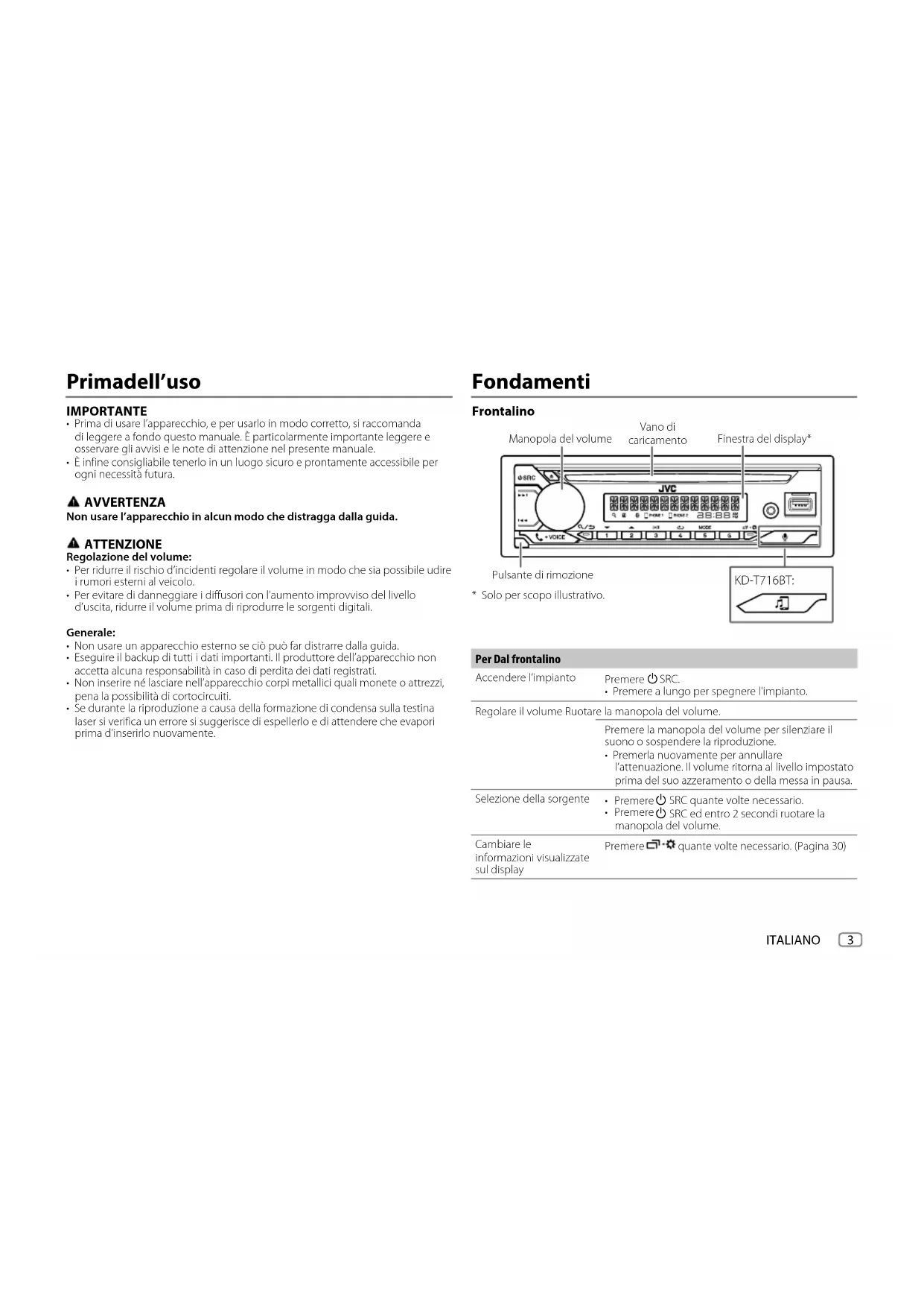 - (PaginaXX) indica la disponibilità di riferimenti nella pagina specificata. Questo simbolo visibile sull’apparecchio indica che nel manuale sono presenti istruzioni importanti sull’uso e la manutenzione. Si raccomanda pertanto di leggerle con attenzione. JS_JVC_KD_T812BT_E_IT.indd 2JS_JVC_KD_T812BT_E_IT.indd 2 24/7/2019 2:35:03 PM24/7/2019 2:35:03 PMITALIANO