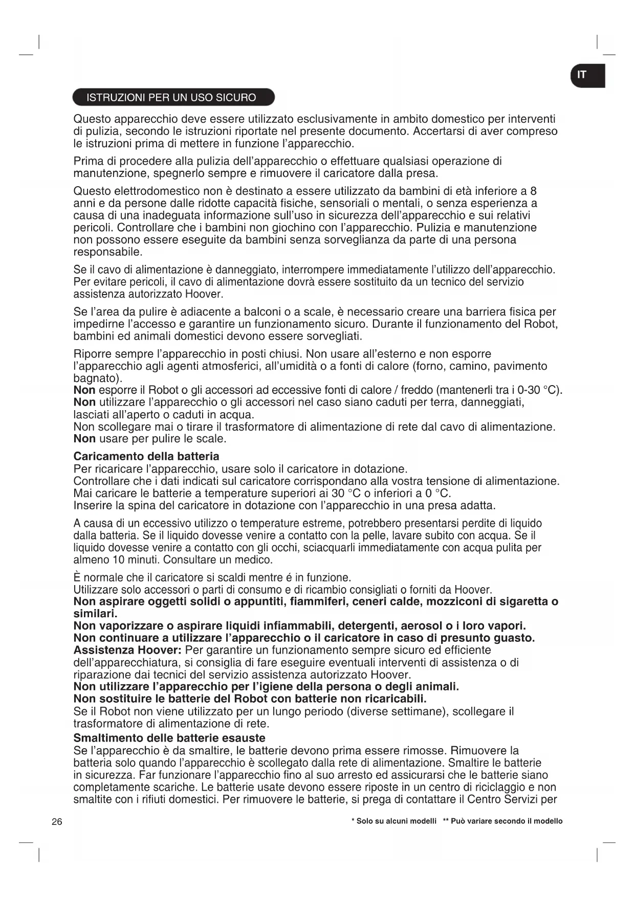 Questo apparecchio deve essere utilizzato esclusivamente in ambito domestico per interventi di pulizia, secondo le istruzioni riportate nel presente documento. Accertarsi di aver compreso le istruzioni prima di mettere in funzione l’apparecchio. Prima di procedere alla pulizia dell’apparecchio o effettuare qualsiasi operazione di manutenzione, spegnerlo sempre e rimuovere il caricatore dalla presa. Questo elettrodomestico non è destinato a essere utilizzato da bambini di età inferiore a 8 anni e da persone dalle ridotte capacità siche, sensoriali o mentali, o senza esperienza a causa di una inadeguata informazione sull’uso in sicurezza dell’apparecchio e sui relativi pericoli. Controllare che i bambini non giochino con l’apparecchio. Pulizia e manutenzione non possono essere eseguite da bambini senza sorveglianza da parte di una persona responsabile. Se il cavo di alimentazione è danneggiato, interrompere immediatamente l’utilizzo dell’apparecchio. Per evitare pericoli, il cavo di alimentazione dovrà essere sostituito da un tecnico del servizio assistenza autorizzato Hoover. Se l’area da pulire è adiacente a balconi o a scale, è necessario creare una barriera sica per impedirne l’accesso e garantire un funzionamento sicuro. Durante il funzionamento del Robot, bambini ed animali domestici devono essere sorvegliati. Riporre sempre l’apparecchio in posti chiusi. Non usare all’esterno e non esporre l’apparecchio agli agenti atmosferici, all’umidità o a fonti di calore (forno, camino, pavimento bagnato). Non esporre il Robot o gli accessori ad eccessive fonti di calore / freddo (mantenerli tra i 0-30 °C). Non utilizzare l’apparecchio o gli accessori nel caso siano caduti per terra, danneggiati, lasciati all’aperto o caduti in acqua. Non scollegare mai o tirare il trasformatore di alimentazione di rete dal cavo di alimentazione. Non usare per pulire le scale. Caricamento della batteria Per ricaricare l’apparecchio, usare solo il caricatore in dotazione. Controllare che i dati indicati sul caricatore corrispondano alla vostra tensione di alimentazione. Mai caricare le batterie a temperature superiori ai 30 °C o inferiori a 0 °C. Inserire la spina del caricatore in dotazione con l’apparecchio in una presa adatta. A causa di un eccessivo utilizzo o temperature estreme, potrebbero presentarsi perdite di liquido dalla batteria. Se il liquido dovesse venire a contatto con la pelle, lavare subito con acqua. Se il liquido dovesse venire a contatto con gli occhi, sciacquarli immediatamente con acqua pulita per almeno 10 minuti. Consultare un medico. È normale che il caricatore si scaldi mentre é in funzione. Utilizzare solo accessori o parti di consumo e di ricambio consigliati o forniti da Hoover. Non aspirare oggetti solidi o appuntiti, ammiferi, ceneri calde, mozziconi di sigaretta o similari. Non vaporizzare o aspirare liquidi inammabili, detergenti, aerosol o i loro vapori. Non continuare a utilizzare l’apparecchio o il caricatore in caso di presunto guasto. Assistenza Hoover: Per garantire un funzionamento sempre sicuro ed efciente dell’apparecchiatura, si consiglia di fare eseguire eventuali interventi di assistenza o di riparazione dai tecnici del servizio assistenza autorizzato Hoover. Non utilizzare l’apparecchio per l’igiene della persona o degli animali. Non sostituire le batterie del Robot con batterie non ricaricabili. Se il Robot non viene utilizzato per un lungo periodo (diverse settimane), scollegare il trasformatore di alimentazione di rete. Smaltimento delle batterie esauste Se l’apparecchio è da smaltire, le batterie devono prima essere rimosse. Rimuovere la batter ia solo quando l’apparecchio è scollegato dalla rete di alimentazione. Smaltire le batterie in sicurezza. Far funzionare l’apparecchio no al suo arresto ed assicurarsi che le batterie siano completamente scariche. Le batterie usate devono essere riposte in un centro di riciclaggio e non smaltite con i riuti domestici. Per rimuovere le batterie, si prega di contattare il Centro Servizi per