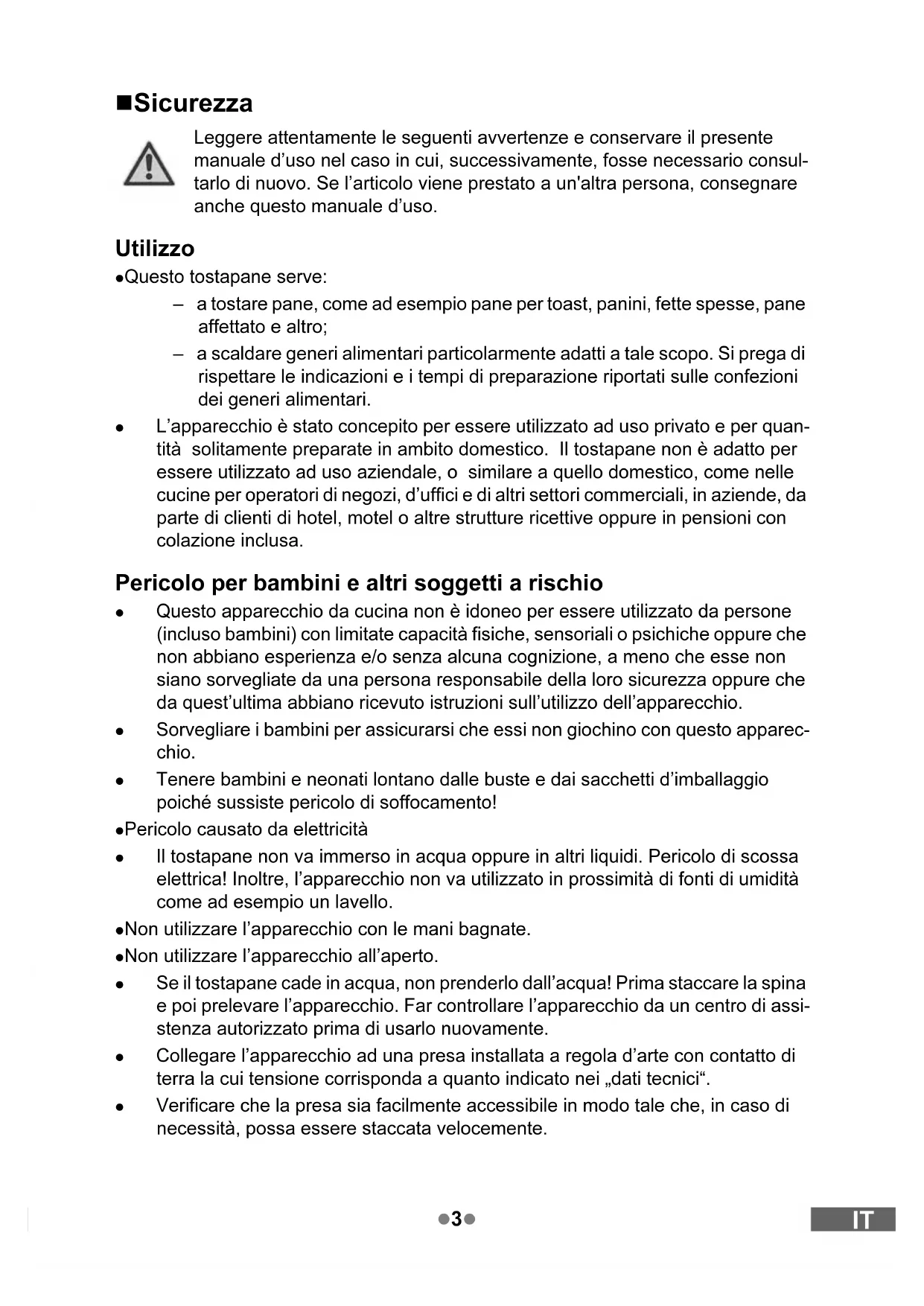 Il tostapane non va immerso in acqua oppure in altri liquidi. Pericolo di scossa elettrica! Inoltre, l'apparecchio non va utilizzato in prossimità di fonti di umidità come ad esempio un lavello. - Nonutilizzare l'apparecchio con le mani bagnate.