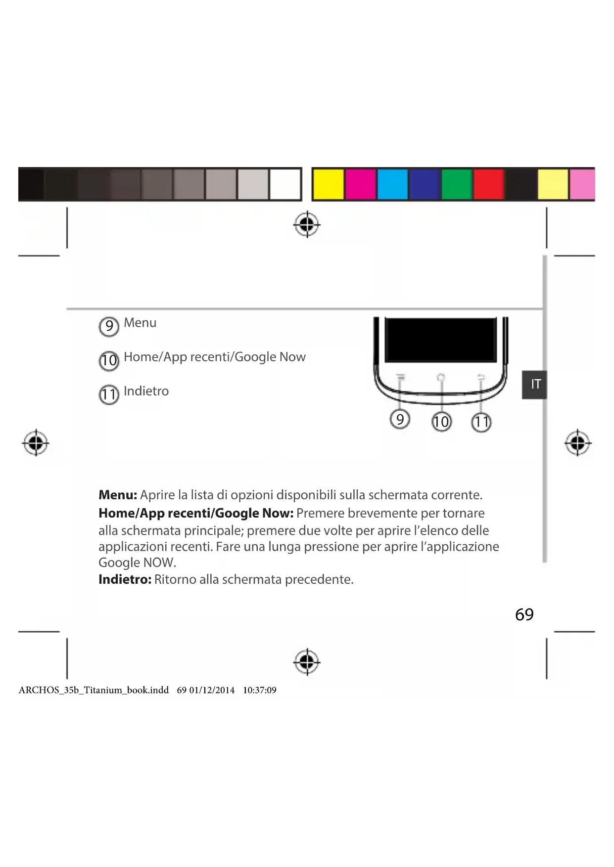Menu Home/App recenti/Google Now Indietro Menu: Aprire la lista di opzioni disponibili sulla schermata corrente. Home/App recenti/Google Now: Premere brevemente per tornare alla schermata principale; premere due volte per aprire l’elenco delle applicazioni recenti. Fare una lunga pressione per aprire l’applicazione Google NOW. Indietro: Ritorno alla schermata precedente. ARCHOS_35b_Titanium_book.indd 69 01/12/2014 10:37:0970 Assemblaggio Apertura